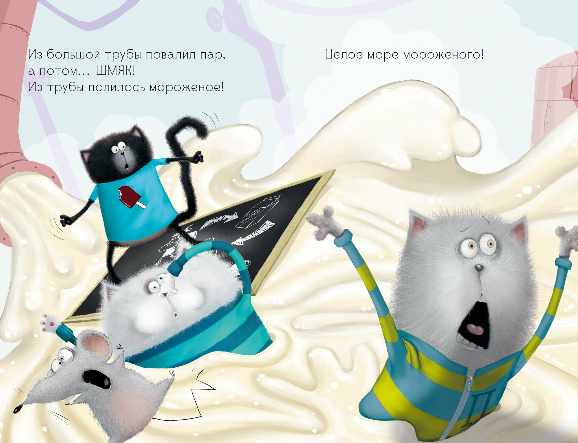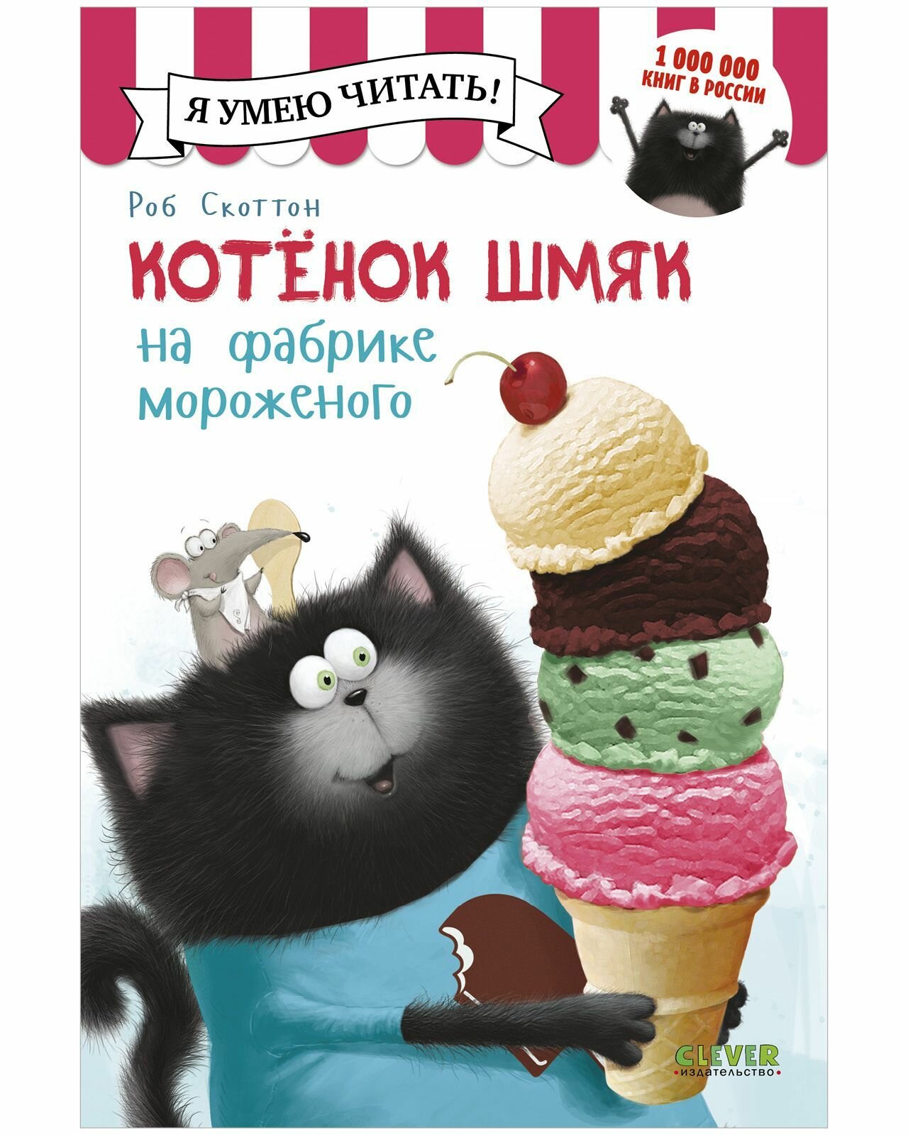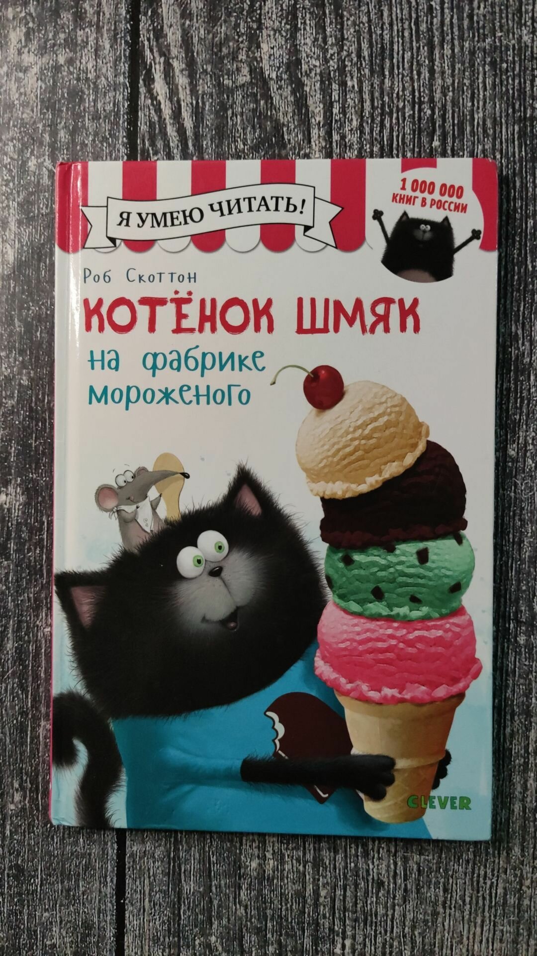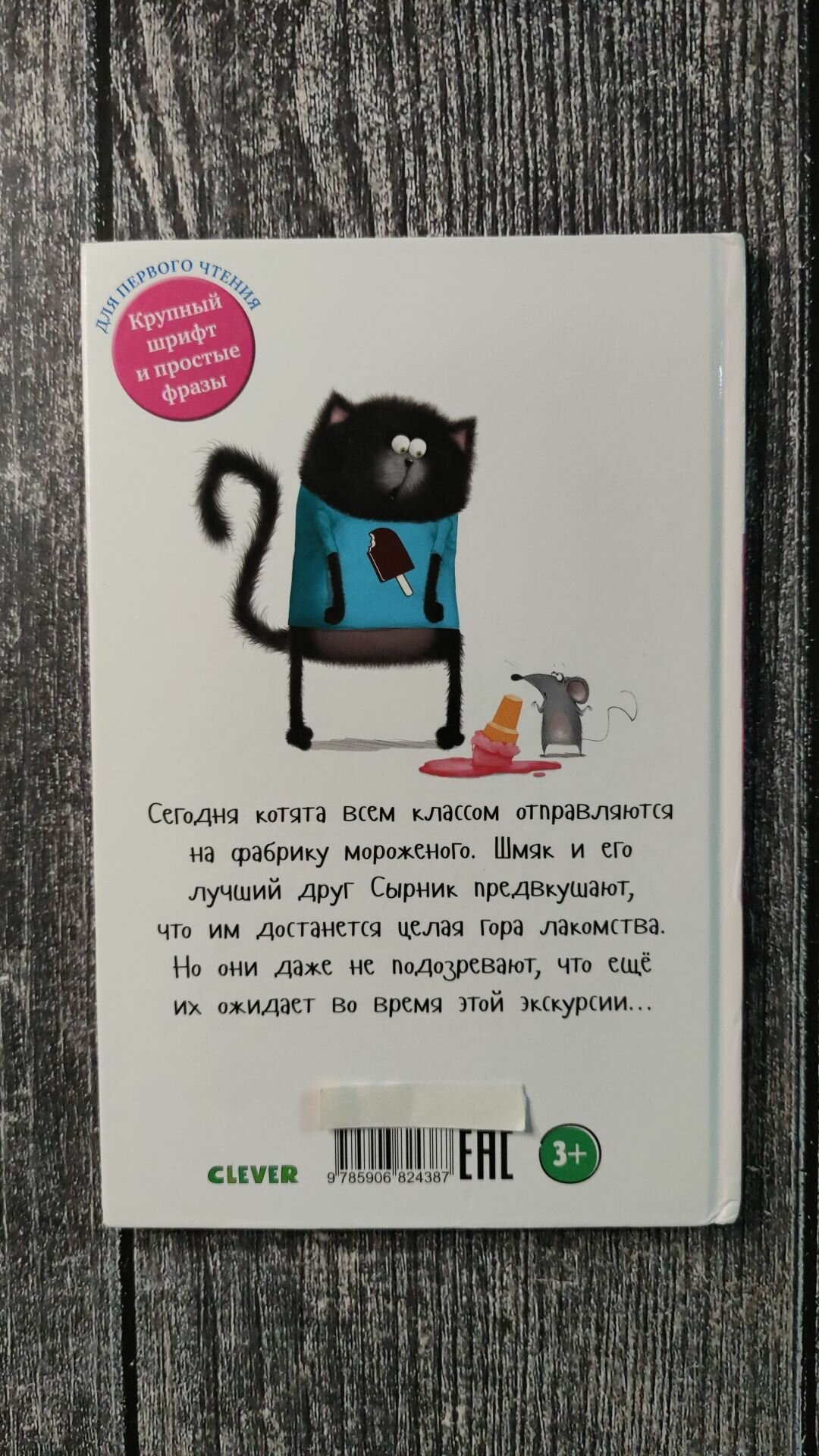 Любимая книга моего сына. Из всей серии книжек про Шмяка ему больше всего нравится именно она. Не удивительно, ведь в этой книге котята с миссис Пухлисс отправляются на фабрику мороженого к мистеру Зефиру. Котят ждет море мороженого, целые горы шоколадной крошки и незабываемое приключение. Главные достоинства этой книги — доступный и понятный 4 — 8 летнему ребенку текст, обилие забавных котиков, интересный сюжет и простые фразы.