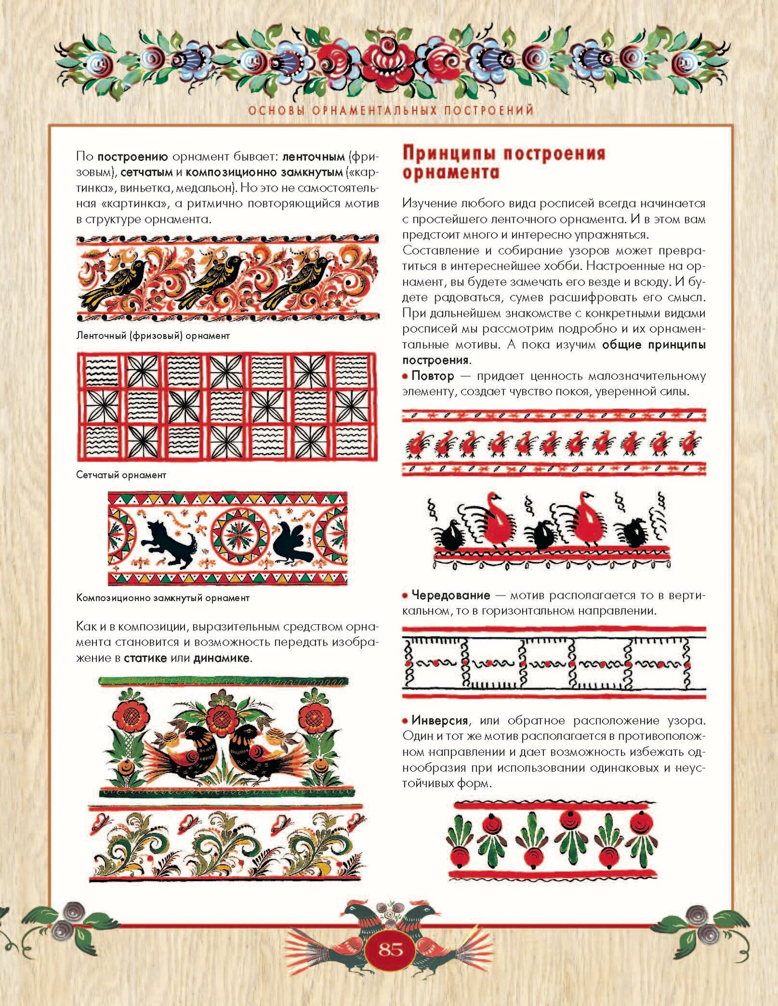 Покупала книгу дочери, которая учится в художественной школе и увлекается декоративно-прикладным искусством, но с удовольствием прочитала сама. Есть и теоретическая часть - информация про историю промыслов, про символическое значение элементов орнамента - и очень подробные практические рекомендации. Интересные и понятные технические советы для тех, кто хочет сам попробовать что-либо расписать, - по выбору инструмента и красок для росписи, по подготовке разных видов поверхностей, по постановке руки, по развертке, по закреплению результата и т.д. Видно, что у автора большой практический опыт, и всеми наработками и "хитростями" она щедро делится с читателями. Очень подробно разобраны элементы и приемы 4 традиционных росписей (хохлома, пермогорская, мезенская и городецкая росписи). Показано, как выполнять каждый элемент и какую роль этот элемент может играть в композиции, где он будет лучше смотреться. На глазах происходит чудо (иллюстрированное пошагово) - из мазков, дуг или капелек рождаются фигурки животных, цветы и т.д. Когда читала эти советы, у меня было чувство, что сижу на уроке у внимательного и чуткого преподавателя, который предугадывает все вопросы ученика :) Огромное количество иллюстраций. Есть фотографии и старинной расписной утвари, и современных работ (роспись самых разных предметов - от сапог до мобильных телефонов). Книга красиво оформлена, на каждой странице - рамка с орнаментом, так что понравится не только взрослым и юным художникам, но и совсем маленьким "читателям", которые могут просто рассматривать картинки.