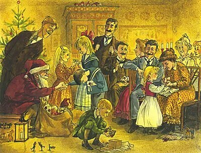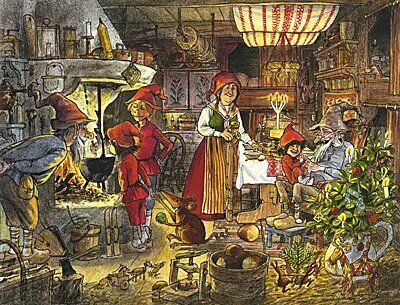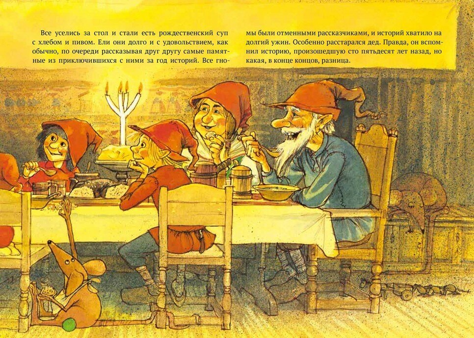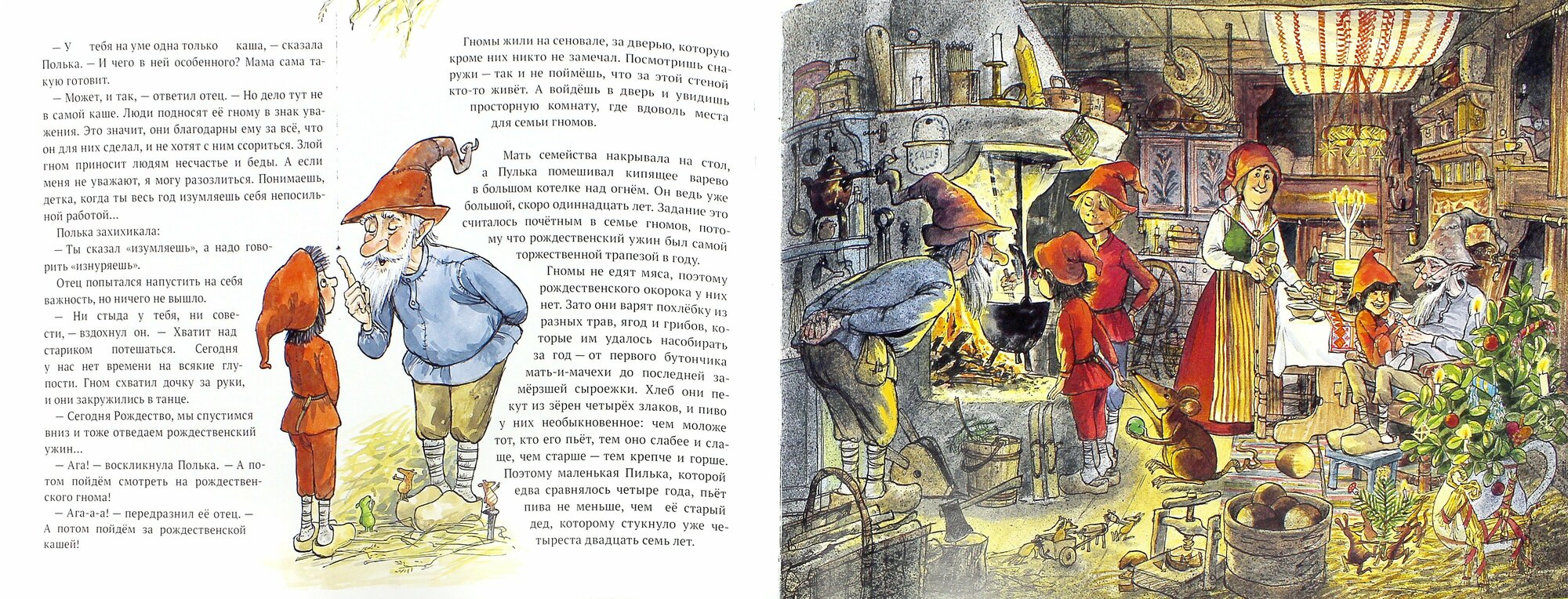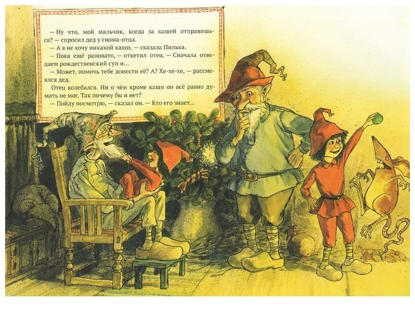 О семействе гномов, живущих в доме людей и следящими за порядком в доме, такие домовята. И о замечательной традиции подносить гномам в Рождество подарок -тарелку рождественской каши, которой угощают всех гостей в этот день. -