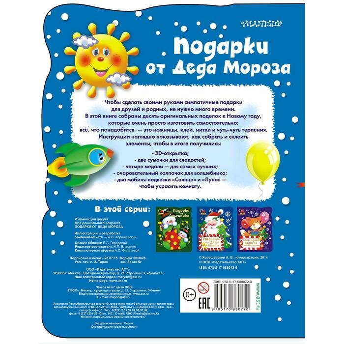 Брала книжечку для четырехлетнего сына. Оформление хорошее, картинки красочные. Задания сыну понравились. Выполнял с моей помощью, я преимущественно вырезала. Нужно было сделать праздничный колпак, мобиль-украшение в комнату, сумочки для конфет, медали и открытку "с днем рождения". Все эти атрибуты для празднования Дня Рождения! Не совсем понятно, почему на обложке присутствует новогодняя тематика