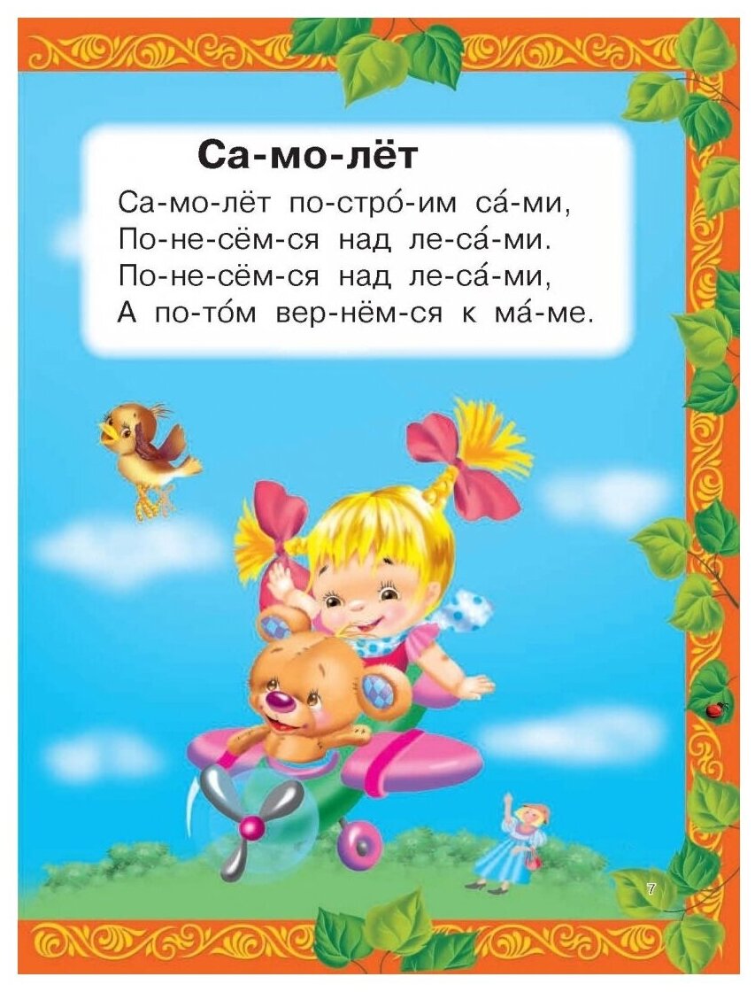 Книга понравилась. Прекрасные иллюстрации, крупный шрифт. Стихи начинающим читать проще, чем прозу. Объем текста небольшой. Но книгу читали не так долго, месяца 2. Позже мешало разбиение на слога. Стали покупать такие же книги, но с целыми словами. Есть ударения.