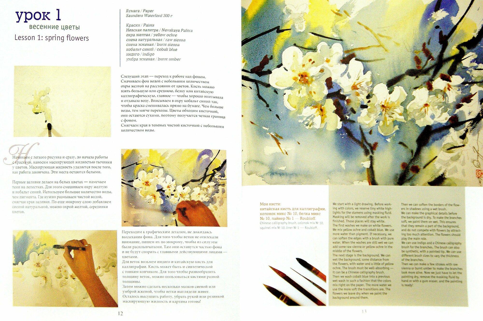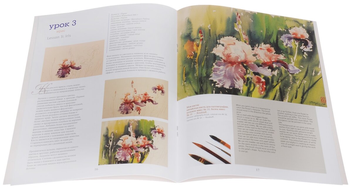 В описании к урокам есть список красок, которые использовались и кистей. Иллюстрации(по цвету) готовой работы в книге и на видео в некоторых уроках разные.