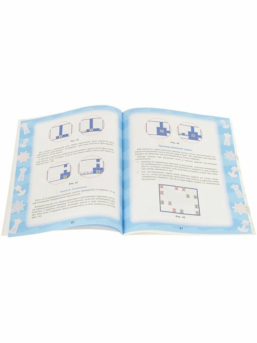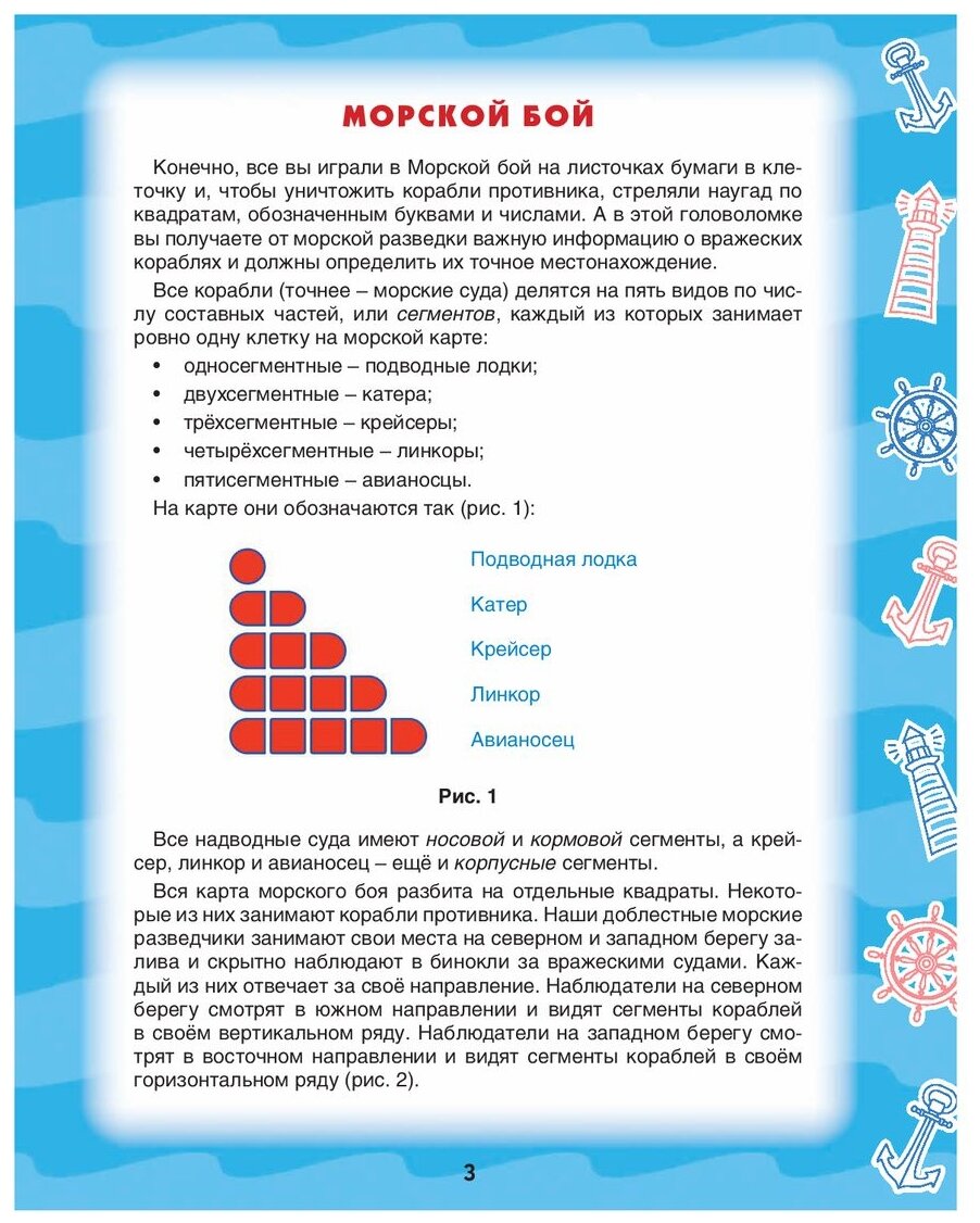 Книга предназначена для интеллектуального досуга детей младшего и среднего школьного возраста, старшие могут использовать ее как тренажер умственных способностей. Она развивает внимание, наблюдательность, память, сообразительность, смекалку, логическое мышление, целеустремлённость, самостоятельность и самоконтроль, аккуратность и обучаемость. В ней собраны самые популярные современные головоломки на морскую тему: Морской бой, Маяки, Боевые маяки, Морской сапёр. Для каждого типа задач приведены цветные схемы, иллюстрирующие правила и приемы решения. Всего в книге 115 задач, представленных в виде морских карт, составленных вручную и тщательно проверенных. Ответы к заданиям даны в конце книги.