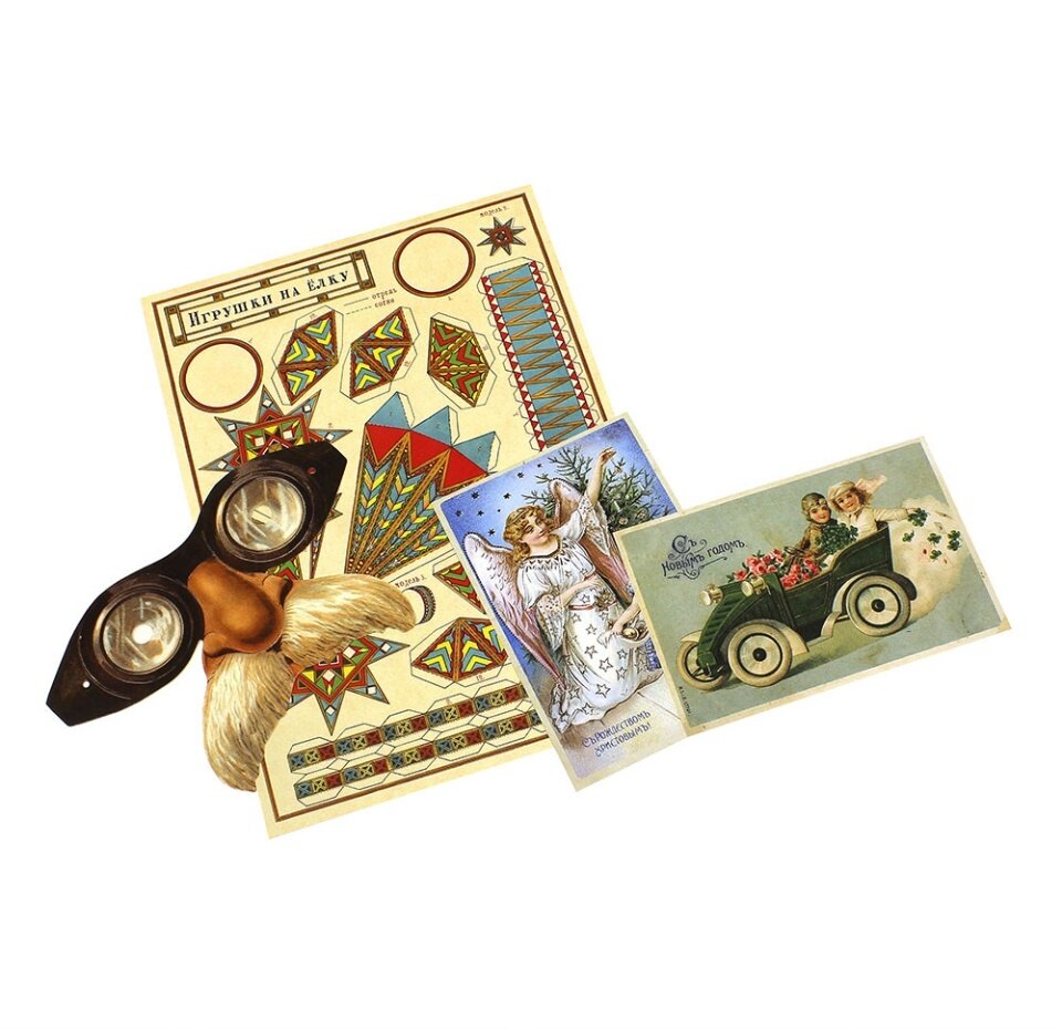 Ещё внутри есть копии старинных открыток, маски и новогодних игрушек.