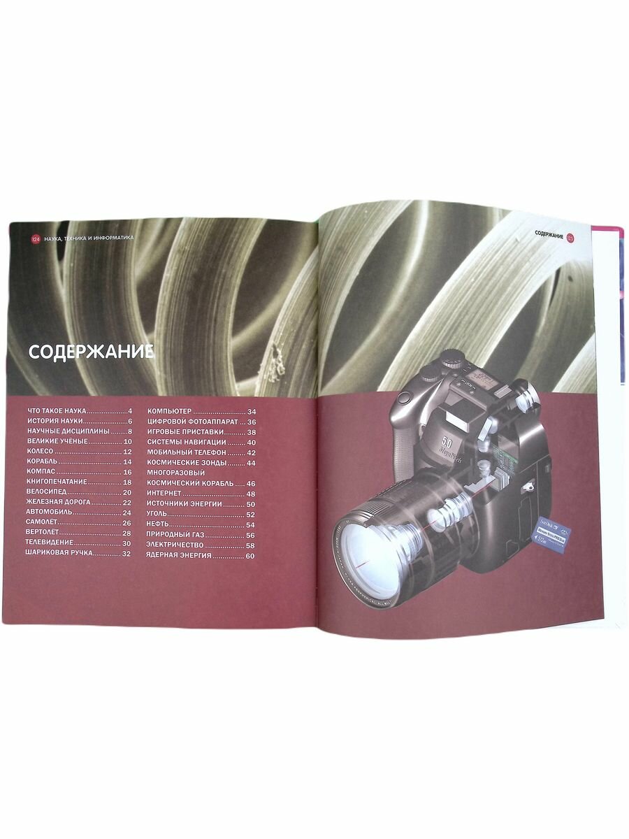 В книге меня в первую очередь привлек ее дизайн и оформление. Прям ну очень много натуральных иллюстраций. Ее прям хочется рассматривать и читать. Несколько глав я даже сам почитал, поэтому могу сказать, что написано весьма просто и понятно, нет сложных терминов и слов. Качество самой книги тоже на высоте: текст везде четкий, бумага не просвечивает, даже несмотря на обилие иллюстраций, переплет твердый. Содержание не усптупает качеству: тут и про развитие науки и техники, развитие электроэнергии, про космические аппараты и современную технику.