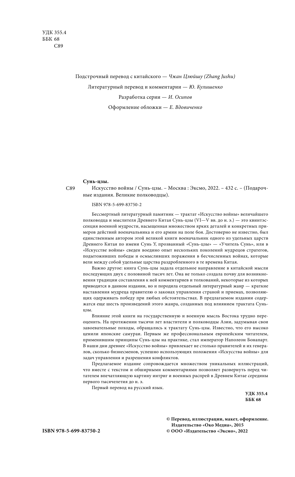 Этот трактат написанный несколько тысячелетий назад не потерял своей актуальности и в наши дни. Все что описано в данной книге, применимо не только к полю боя, но это будет полезно для любого человека. Очень многое, при прочтении Вам окажется знакомым, т.к. этот труд давно разошелся по цитатам, без ссылки на автора. Если говорить, о самом издании, то это превосходная книга, отличного качества, с большим количеством иллюстрированных вставок.