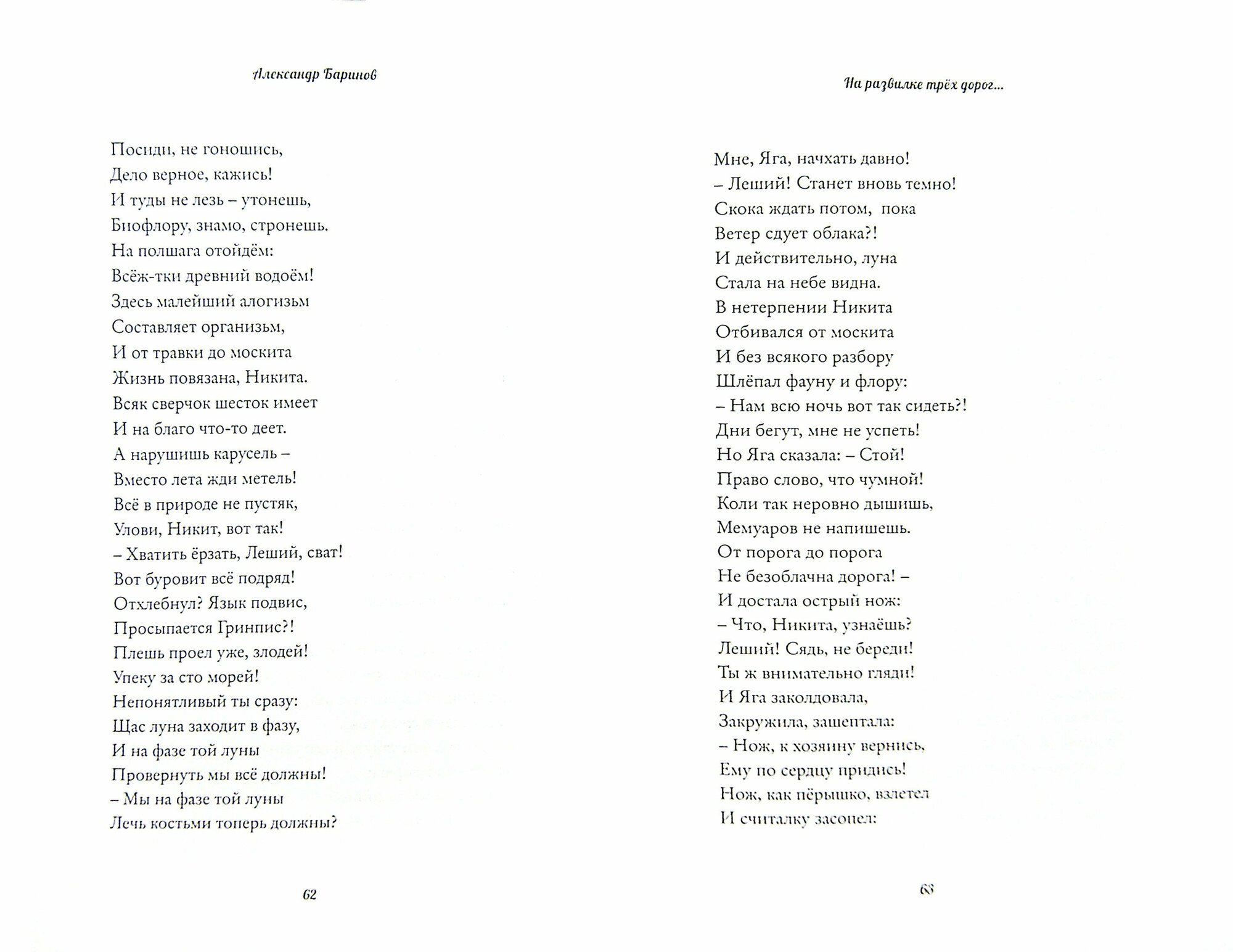 Известный актёр, заслуженный артист России, сыгравший десятки ролей в театре, кино и телесериалах. Диапазон этих ролей очень широк, от комедийных до трагических. Среди самых известных - Боцман (Володя) в фильме "За всё заплачено" о воинах-афганцах, Виталий Палыч из сериала "Глухарь" (со всеми продолжениями), Коля Савкин в сериале "Меч". А ещё Баринов - автор-исполнитель песен и баллад, часто связанных с русским фольклором, который он любит и хорошо знает. Сказка в стихах "На развилке трёх дорог…" - это тоже обращение к фольклору, языком которого автор умеет говорить (причём говорить весело) о вполне современных вещах.