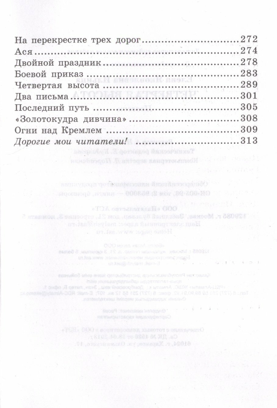 В нашем издании представлена повесть Елены Ильиной «Четвертая высота» — повесть биографическая, рассказывающая о непростой судьбе простой девчонки, девушки Гуле Королёвой, которая прожила очень короткую (всего 20 лет!), но интересную, насыщенную жизнь! Гуля погибла на фронте во время Великой Отечественной войны, борясь за свою очередную «высоту», спасая жизни раненых, под пулями унося их с поля боя.