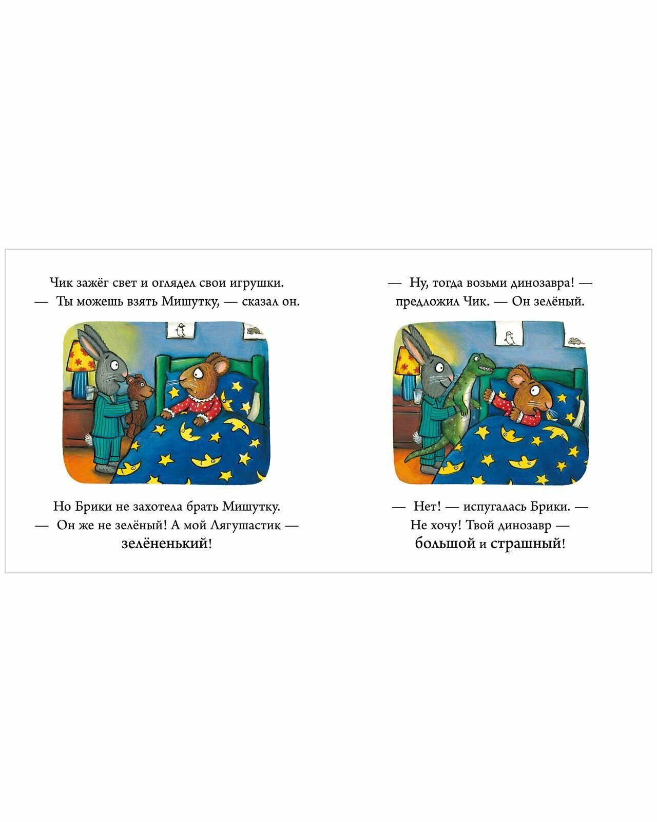 Брики, отправилась в гости с ночевкой к своему другу Чику. Мышка далеко не сразу обнаружила, что забыла свою любимую игрушку - лягушастика, ведь в гостях было чем заняться: друзья не скучали и выдумали много интересных игр. Но вот пришла пора спать, и когда погасили свет, Брики стало чего-то не хватать... И тут она вспомнила про лягушастика, который остался дома. Бедная Брики! Но Чики нашел чем утешить подругу, и не пожалел для нее своей любимой игрушки! Настоящий друг!