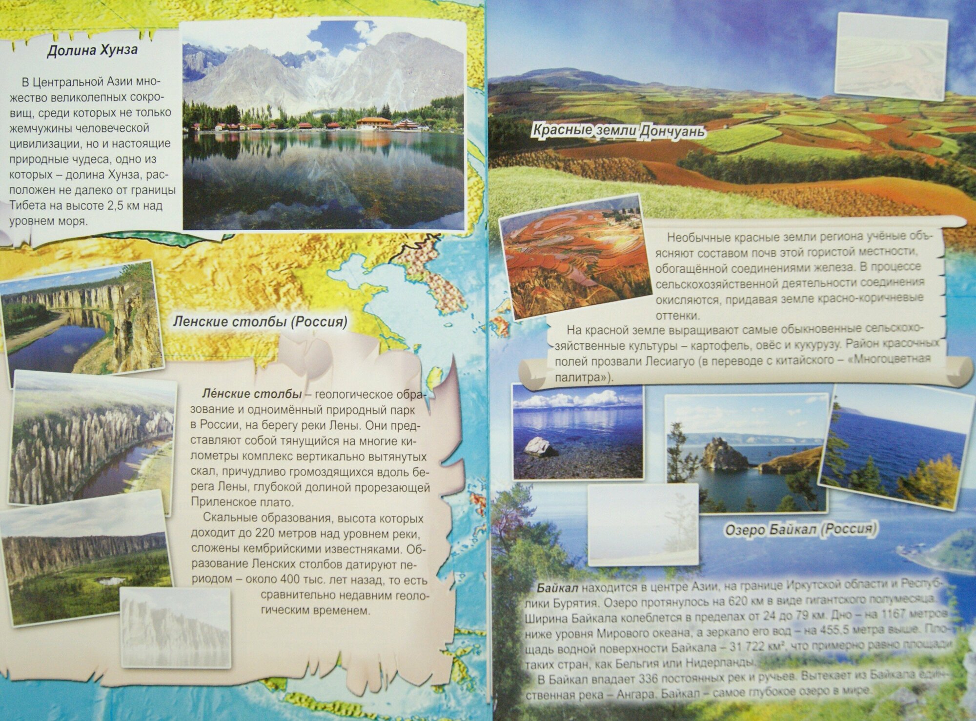 Страницы атласа сразу приковывают к себе внимание, благодаря красочным иллюстрациям и ярким фотографиям необычных мест планеты. Так и хочется перелистывать его снова и снова. Около каждой фотографии находится краткий, но содержательный и интересный рассказ об изображаемом месте. Даже взрослые могут открыть для себя много интересного. А наклейки с изображениями достопримечательностей еще сильнее привлекают внимание ребенка к этой книге. В целом очень понравилась вся серия таких атласов.