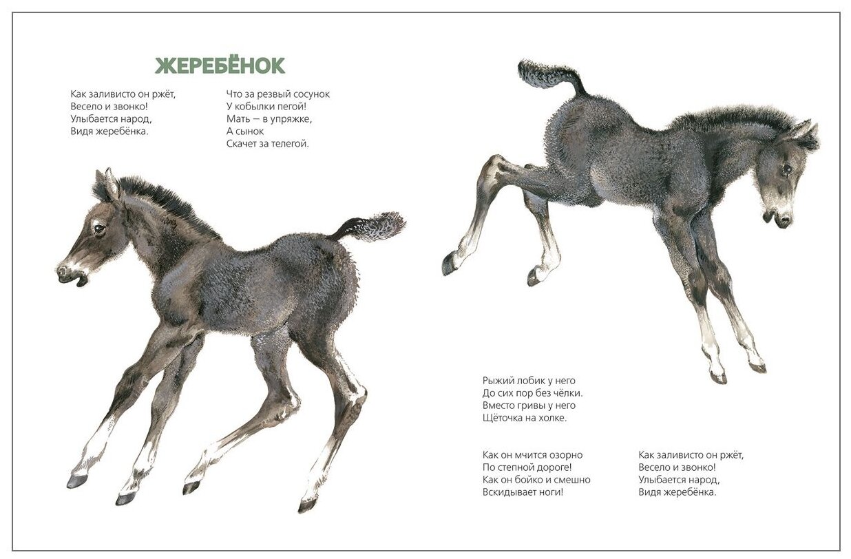 В книге несколько детских стихотворений (Гуси, Жеребёнок, Поросята, Пёс, Два козла, Телёнок, Баран, Кролик, Котище, Индюки, Любознательный петух, Стадо), которые 5-летний ребёнок уже в состоянии запомнить, но и 2-летний слушает с интересом.