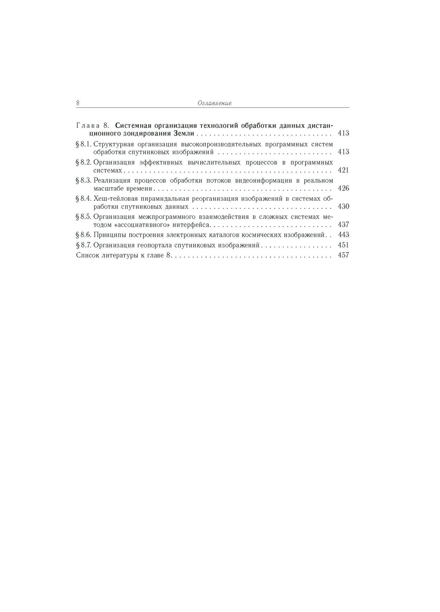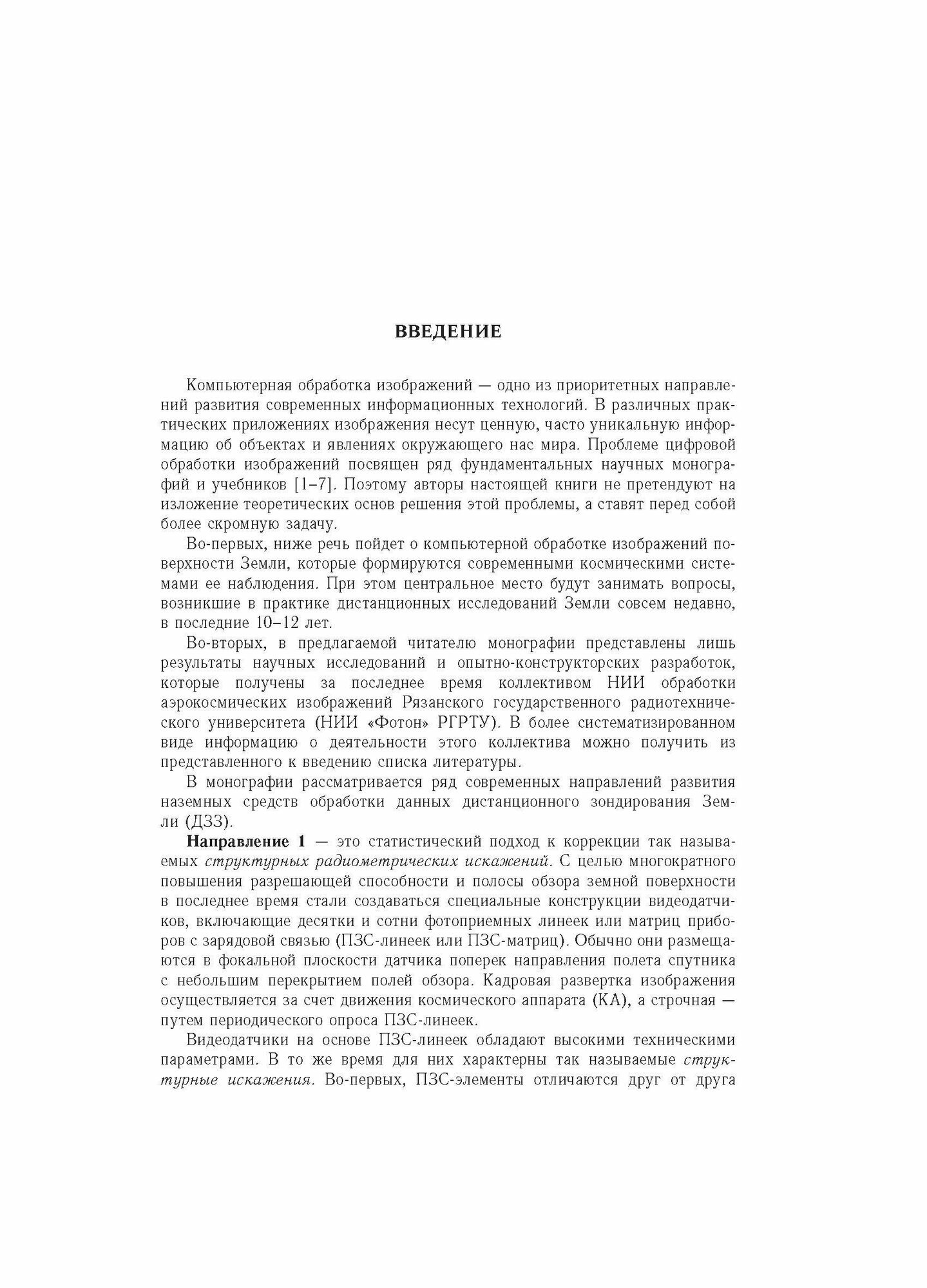 В монографии представлены результаты научных исследований и опытно-конструкторских разработок, которые получены за последние 10 лет коллективом НИИ обработки аэрокосмических изображений Рязанского государственного радиотехнического университета. Основное внимание уделено методам и информационным технологиям компьютерной обработки изображений поверхности Земли, получаемых от современных космических систем дистанционного зондирования. Это технологии статистической радиометрической коррекции спутниковых изображений, структурного восстановления многоскановых снимков, геодезической привязки по электронным картам, стереофотограмметрической обработки видеоданных, цвето-синтезирования, комплексирования и оценки качества спутниковых изображений. Особое внимание уделено вопросам системной организации технологий обработки данных дистанционного зондирования Земли.