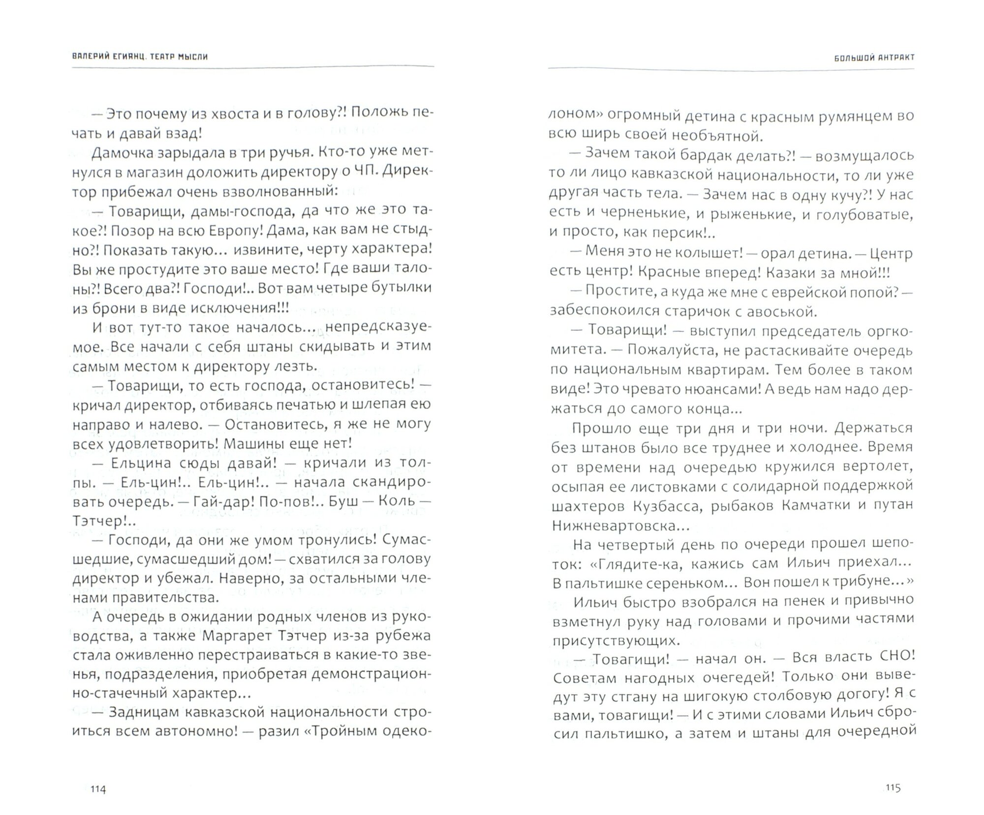Книга Валерия Егиянца пронизана подлинным, интеллектуальным юмором. Это относится к целому ряду прекрасных афоризмов и изящных небольших новелл. Шедевр можно найти практически на каждой странице. Если цитировать, то можно - всю книгу. Приведу парочку глубоких афоризмов: "Созревший афоризм - дитя мысли, а несозревший - ее выкидыш", "Не плюйте в колодец - он уже и так переполнен".