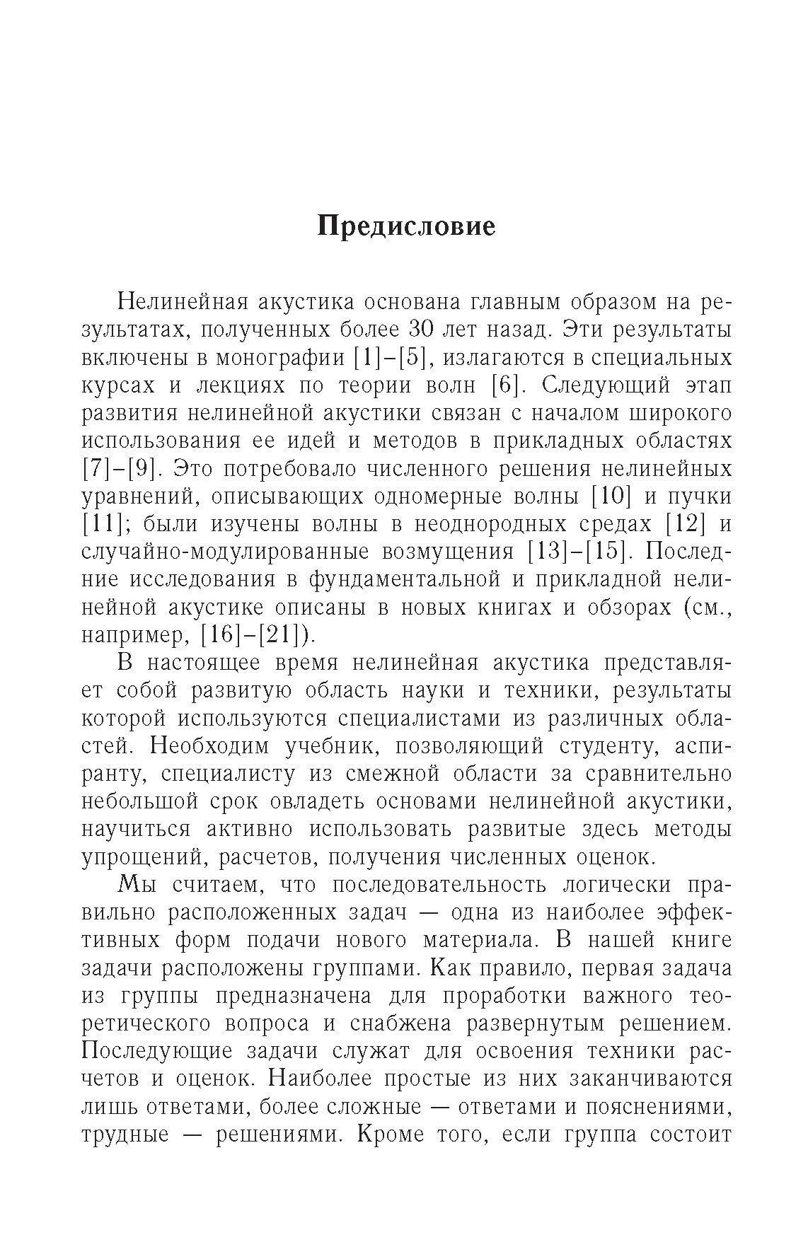 Изложены основы нелинейной акустики. Материал представлен в виде задач с решениями, пояснениями и ответами. В отличие от имеющихся пособий книга помогает читателю не только познакомиться с нелинейными волновыми процессами и способами их описания, но и освоить технику расчетов, получить численные оценки важнейших параметров. Тем самым приобретаются навыки, необходимые для самостоятельной научной работы в этом направлении.
