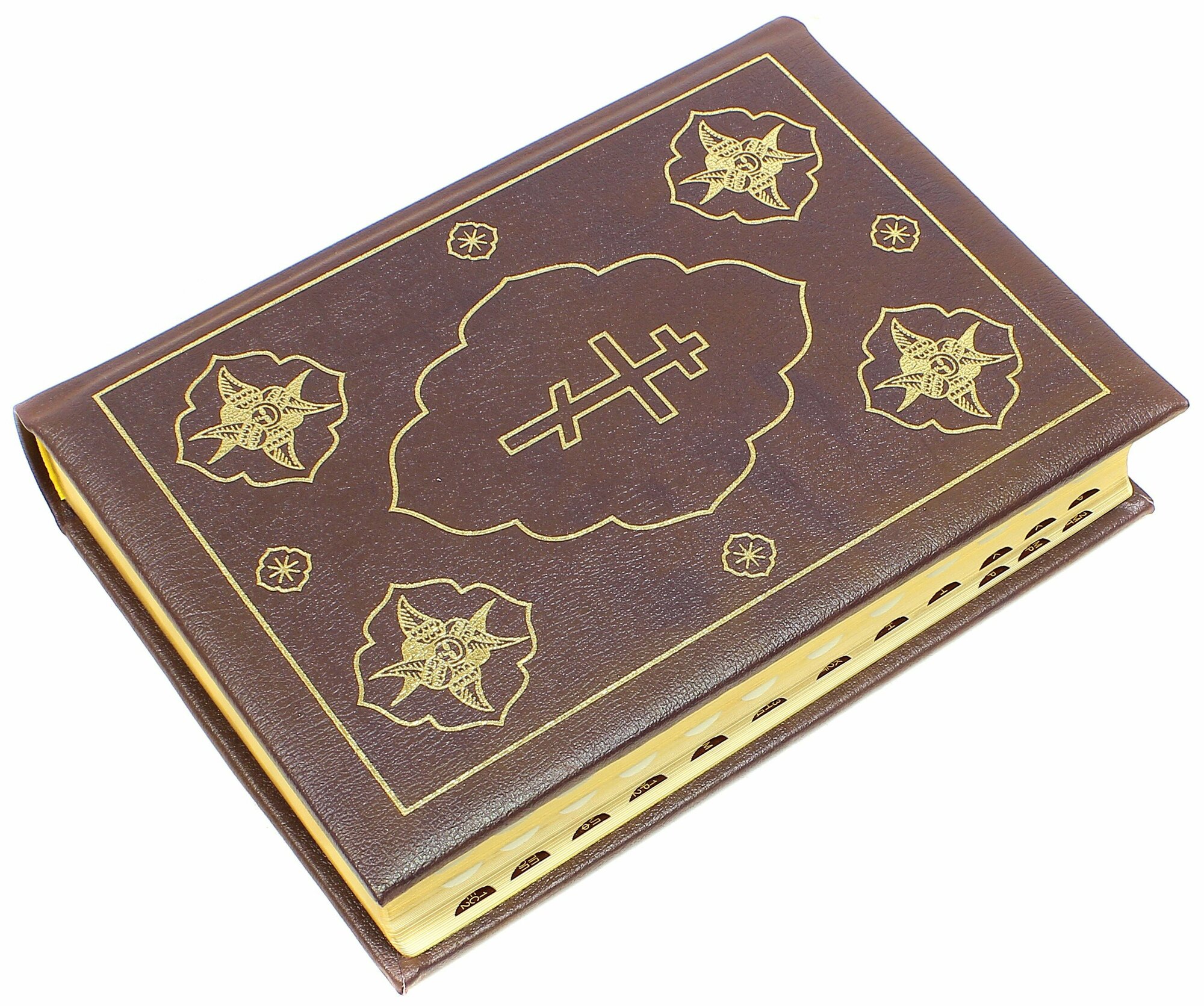 Гибкий переплет из улучшенной кожи , "золотой" обрез, золотое тиснение, индексы для поиска библейских книг, закладка, футляр.