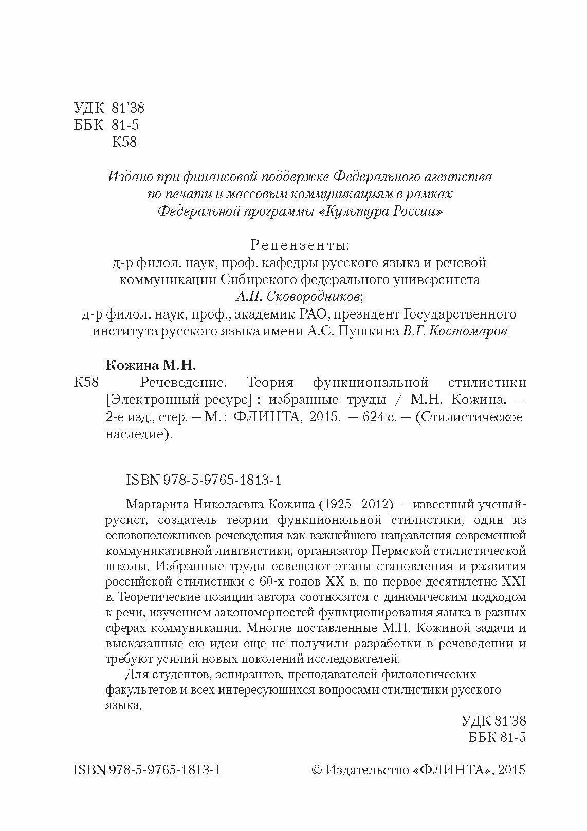 Маргарита Николаевна Кожина (1925—2012) — известный ученый русист, создатель теории функциональной стилистики, один из основоположников речеведения как важнейшего направления современной коммуникативной лингвистики, организатор Пермской стилистической школы. Избранные труды освещают этапы становления и развития российской стилистики с 60-х годов ХХ в. по первое десятилетие XXI в. Теоретические позиции автора соотносятся с динамическим подходом к речи, изучением закономерностей функционирования языка в разных сферах коммуникации. Многие поставленные М.Н. Кожиной задачи и высказанные ею идеи еще не получили разработки в речеведении и требуют усилий новых поколений исследователей. Для студентов, аспирантов, преподавателей филологических факультетов и всех интересующихся вопросами стилистики русского языка.