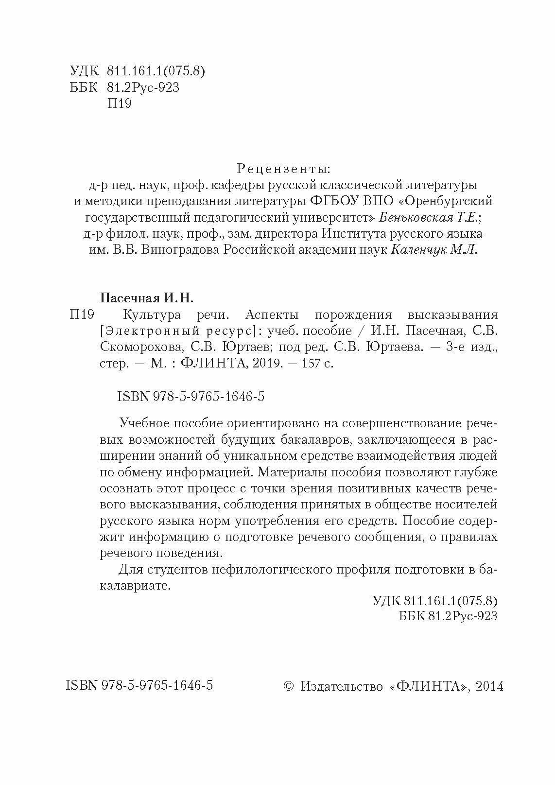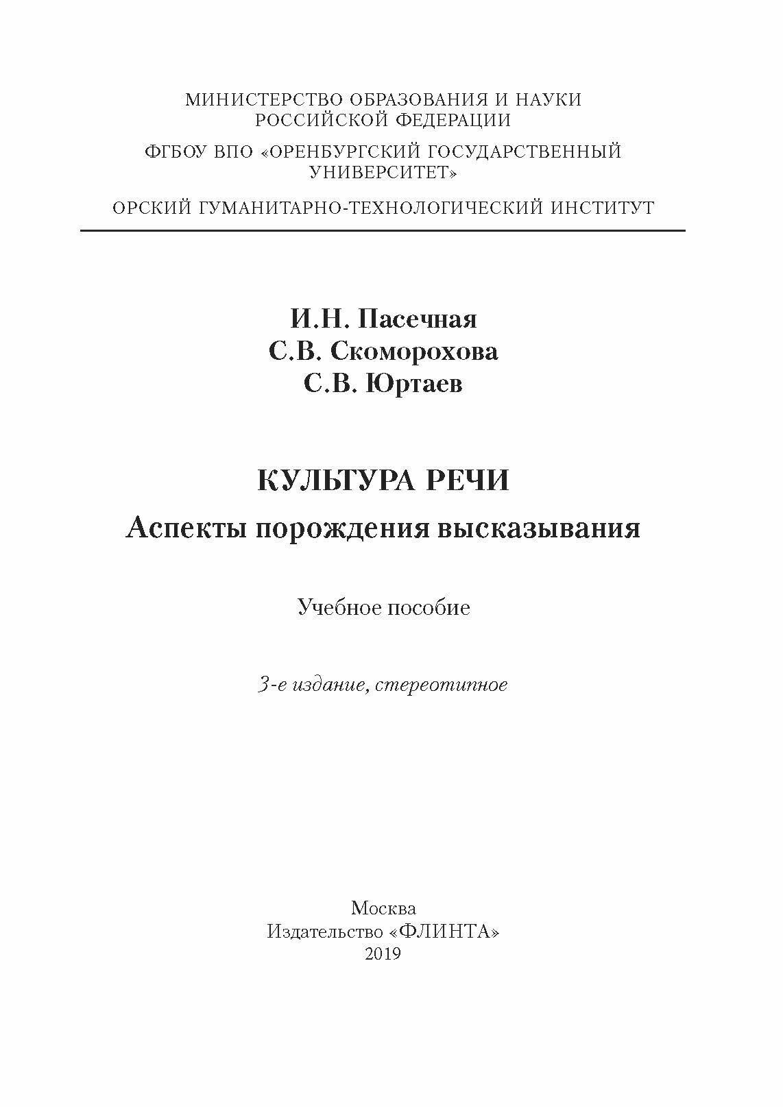 Культура речи. Аспекты порождения высказывания (Юртаев Сергей Васильевич, Пасечная Ирина Николаевна, Скоморохова Светлана Витальевна); Флинта, 2014