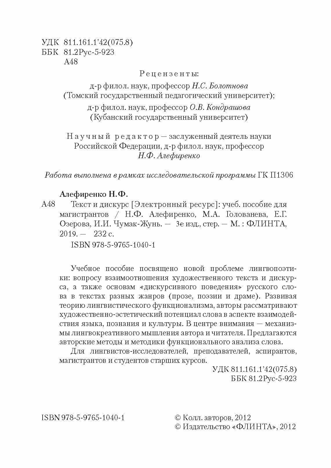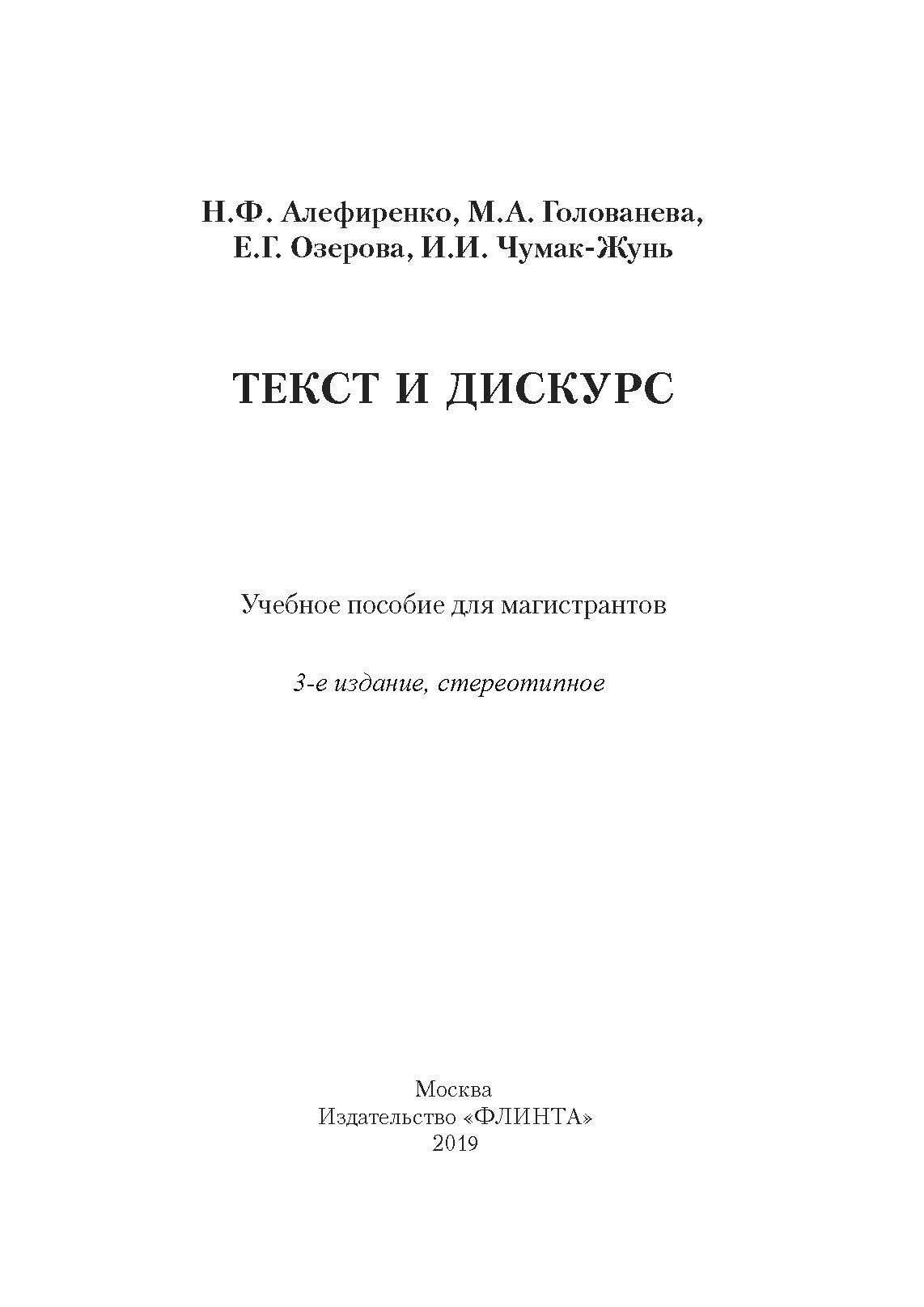 Текст и дискурс: учебное пособие (Алефиренко Николай Федорович, Голованева Марина Анатольевна, Озерова Елена Григорьевна); Флинта, 2012