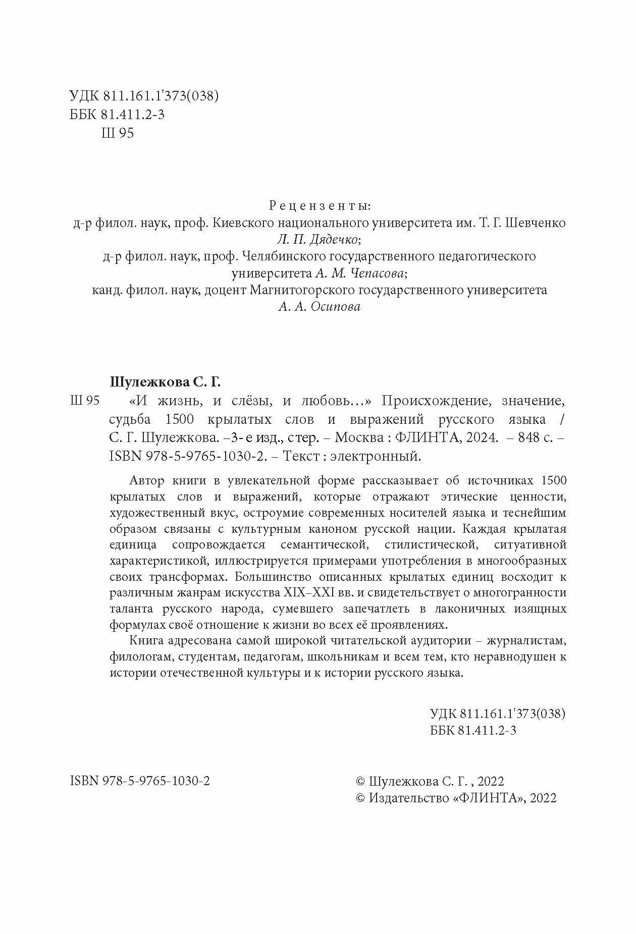 "И жизнь и слезы и любовь" Происхождение значение судьба 1500 крылатых слов и выражений (Шулежкова Светлана Григорьевна); Флинта, 2011