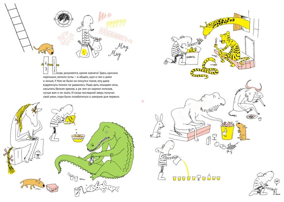 В картинках разворачиваются сюжетные линии, которые в тексте напрямую не отражены, а это всегда радует. И не все можно заметить с первого взгляда. Например, то, что у жены Ноя во время путешествия растет живот...
