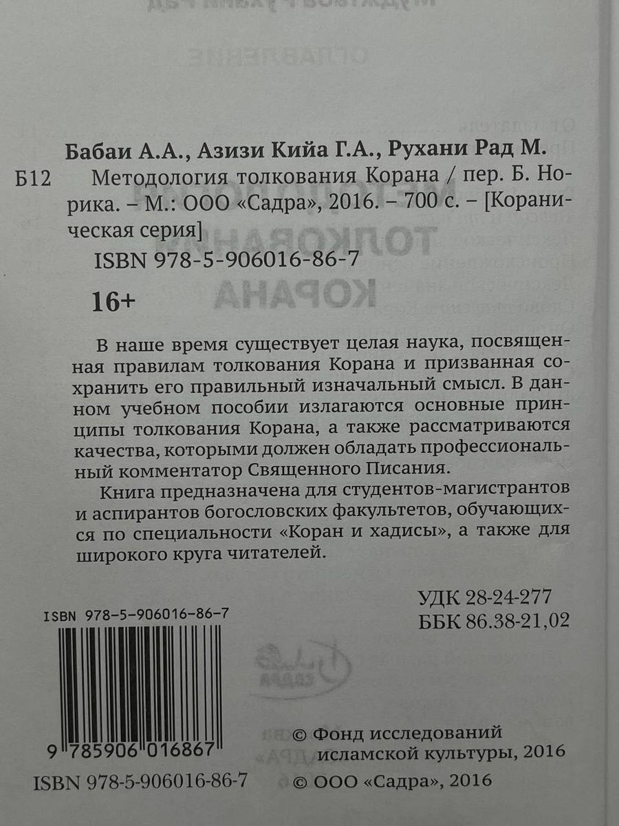 Методология толкования Корана (Бабаи Али Акбар, Гулам Али Азизи Кийа, Муджтаба Рухани Рад); Садра, 2016