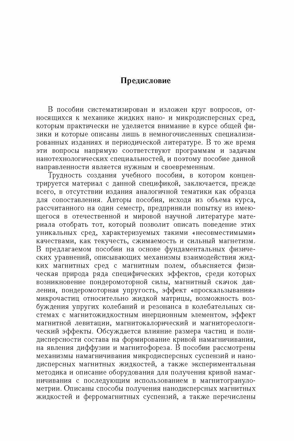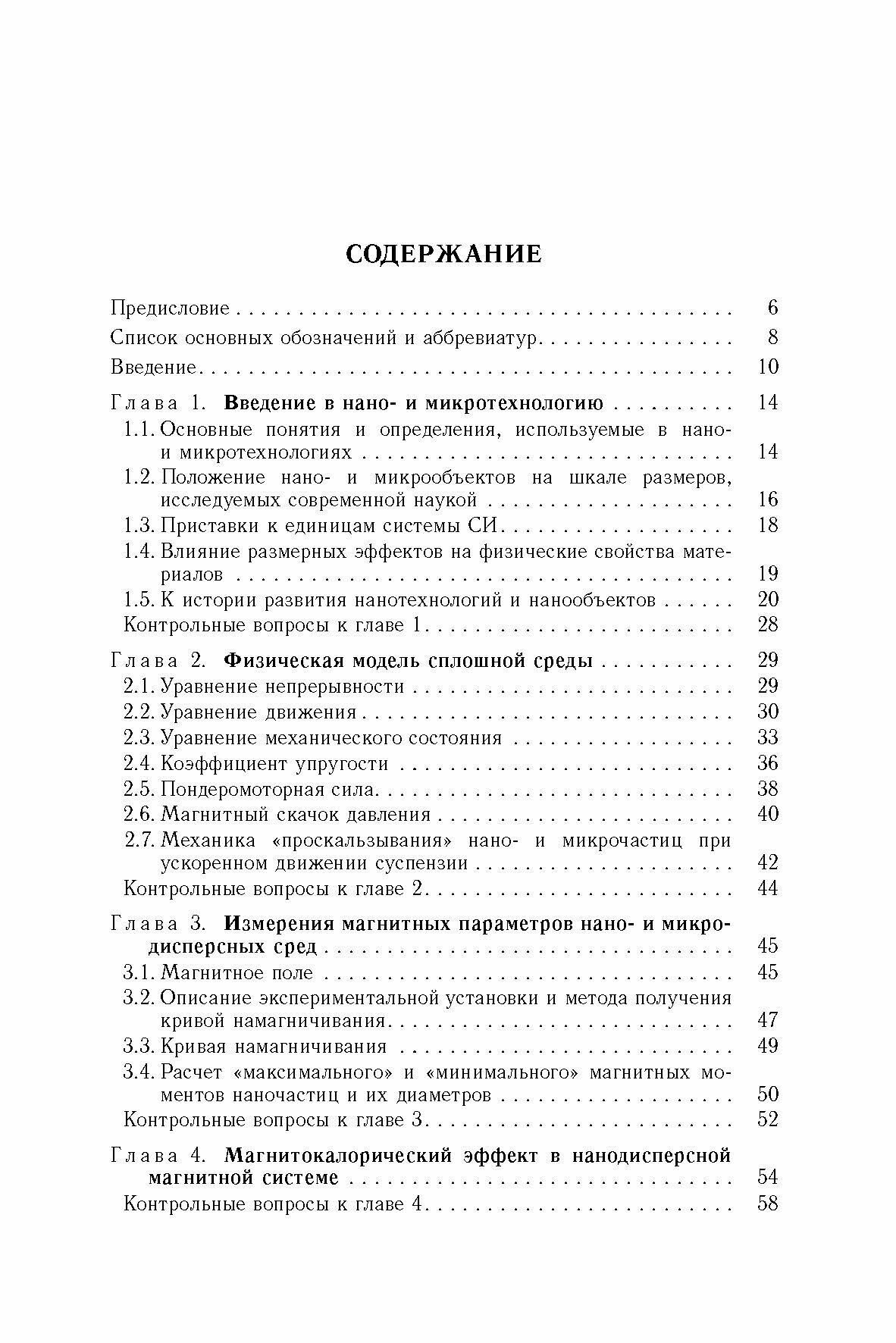 В учебном пособии изложен круг вопросов, относящихся к механике жидких нано- и микродисперсных магнитных сред. Этим вопросам практически не уделяется внимание в курсе общей физики, они описаны лишь в немногочисленных специализированных изданиях и периодической литературе. Приведены уравнения динамики жидких намагничивающихся сред и конкретные задачи с применением этих уравнений. Рассматриваются специфические для нано- и микроразмерных дисперсных систем физические явления: межфазный теплообмен, магнитокалорический эффект, "проскальзывание" нано- и микрочастиц относительно жидкой матрицы, гистерезис намагничивания микродисперсных суспензий, суперпарамагнетизм нанодисперсных магнитных жидкостей, неньютоновский характер реологии суспензий, диффузия и магнитофорез, магнитореологический эффект. Уделено внимание технологиям получения нано- и микродисперсных магнитных сред. На многочисленных примерах показано влияние размерного фактора на физические свойства материалов. Перечисленные вопросы полностью соответствуют программам и задачам нано-технологических специальностей.