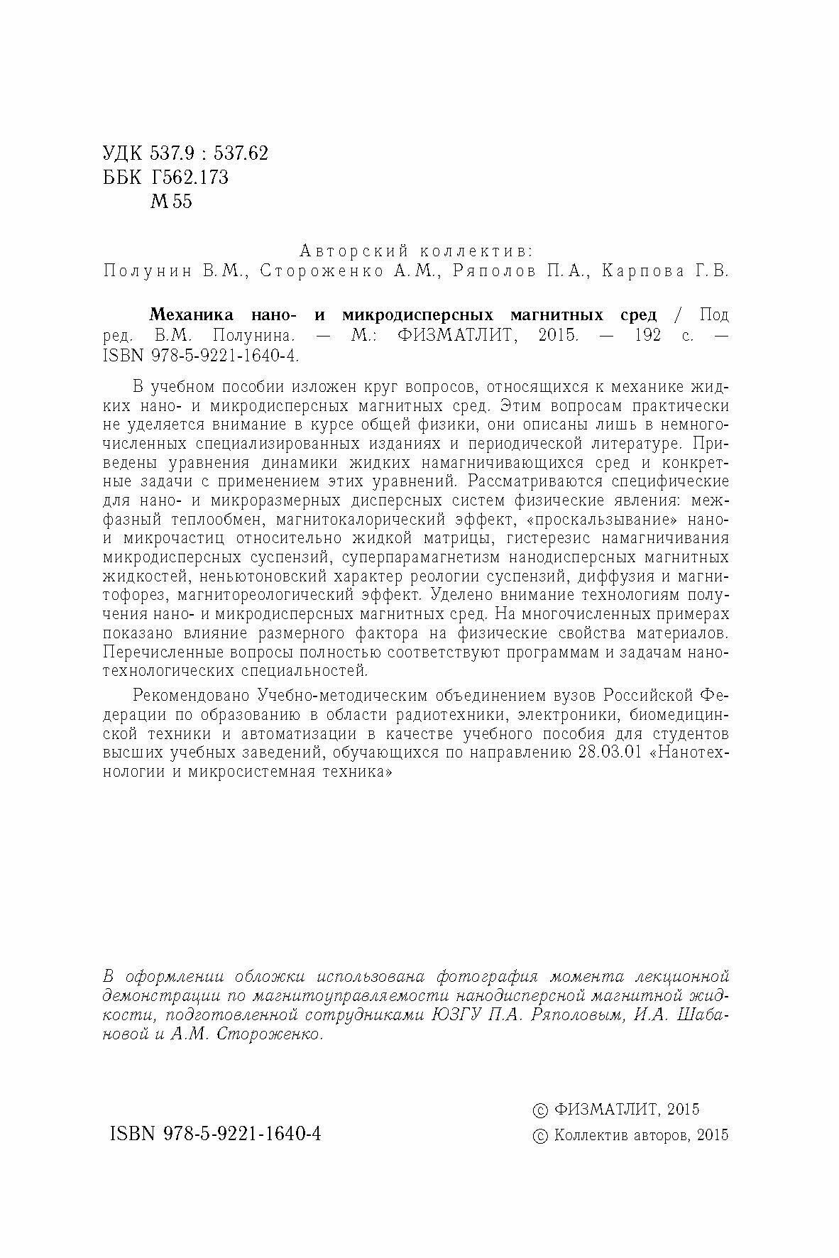 Механика нано- и микродисперсных магнитных сред (Полунин Вячеслав Михайлович, Стороженко Анастасия Михайловна, Ряполов Петр Алексеевич, Карпова Галина Вячеславовна); Физматлит, 2015