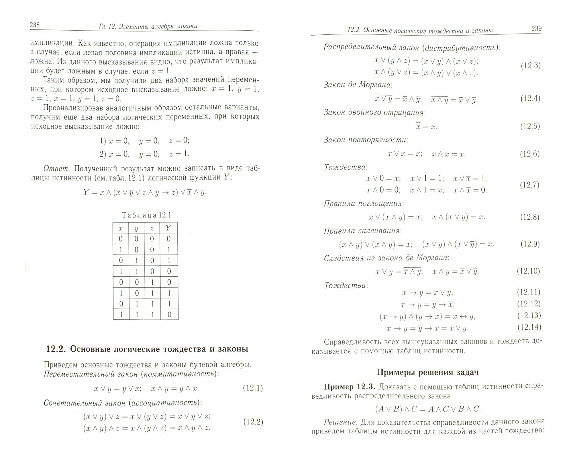 В книге представлены основные разделы дискретной математики: теория множеств, алгоритмов, графов, алгебра логики. Для лучшего усвоения материала использована современная методика обучения на основе решебников. Авторы рассмотрели вопросы исчисления множеств, задания отношений и соответствий, описания упорядоченных бесконечных множеств, мультимножеств и нечетких множеств, основные алгоритмические модели, основные логические функции и законы алгебры логики, виды и способы задания графов, алгоритмы решения задач на ориентированных и неориентированных графах, а также основные определения из теории гиперграфов и нечетких графов. Даются контрольные задачи, упражнения и глоссарий с пояснением основных терминов. Учебник предназначен студентам вузов, обучающимся по направлениям "Информатика и вычислительная техника" и "Информационные системы", может быть полезен также специалистам, занятым разработкой интеллектуальных САПР, систем поддержки и принятия решений, новых информационных технологий в науке, технике, образовании, бизнесе и экономике - кафедра прикладной математики МЭИ (зав. кафедрой, д.т.н., профессор, лауреат премии президента РФ в области образования А.П. Еремеев); - Ю.О. Чернышов, зав. кафедрой прикладной математики и вычислительной техники Ростовской государственной академии сельскохозяйственного машиностроения, д.т.н., профессор, заслуженный деятель науки РФ.
