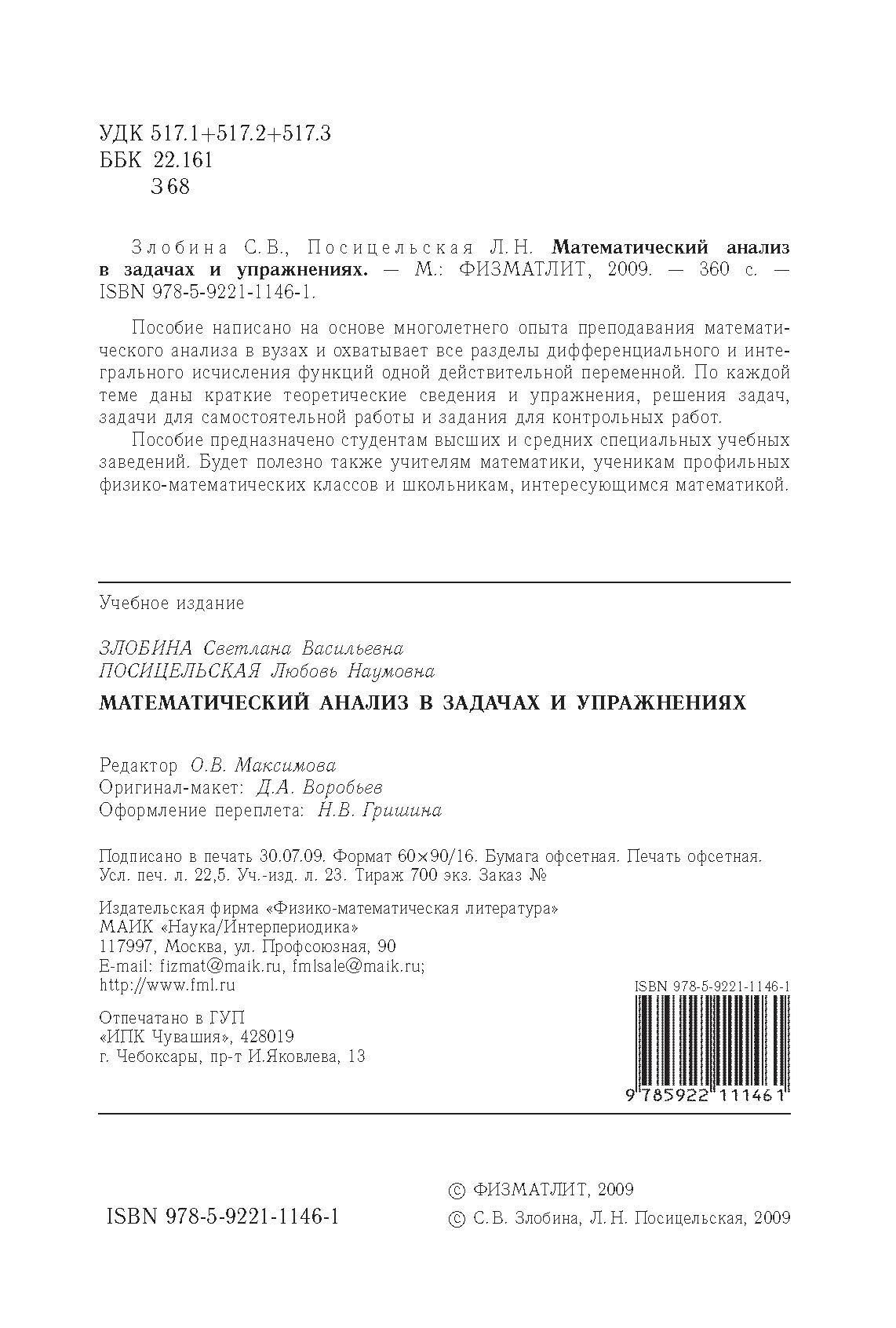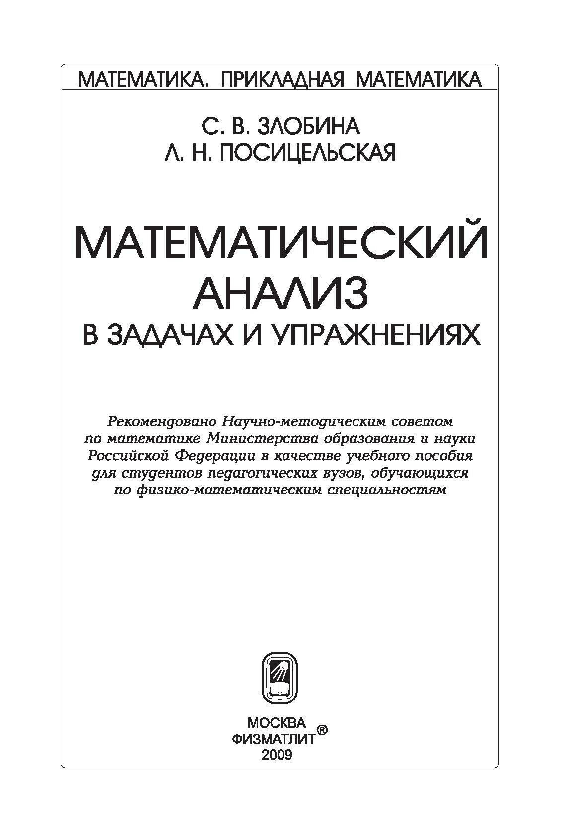 Математический анализ в задачах и упражнениях (Злобина Светлана Васильевна, Посицельская Любовь Наумовна); Физматлит, 2009