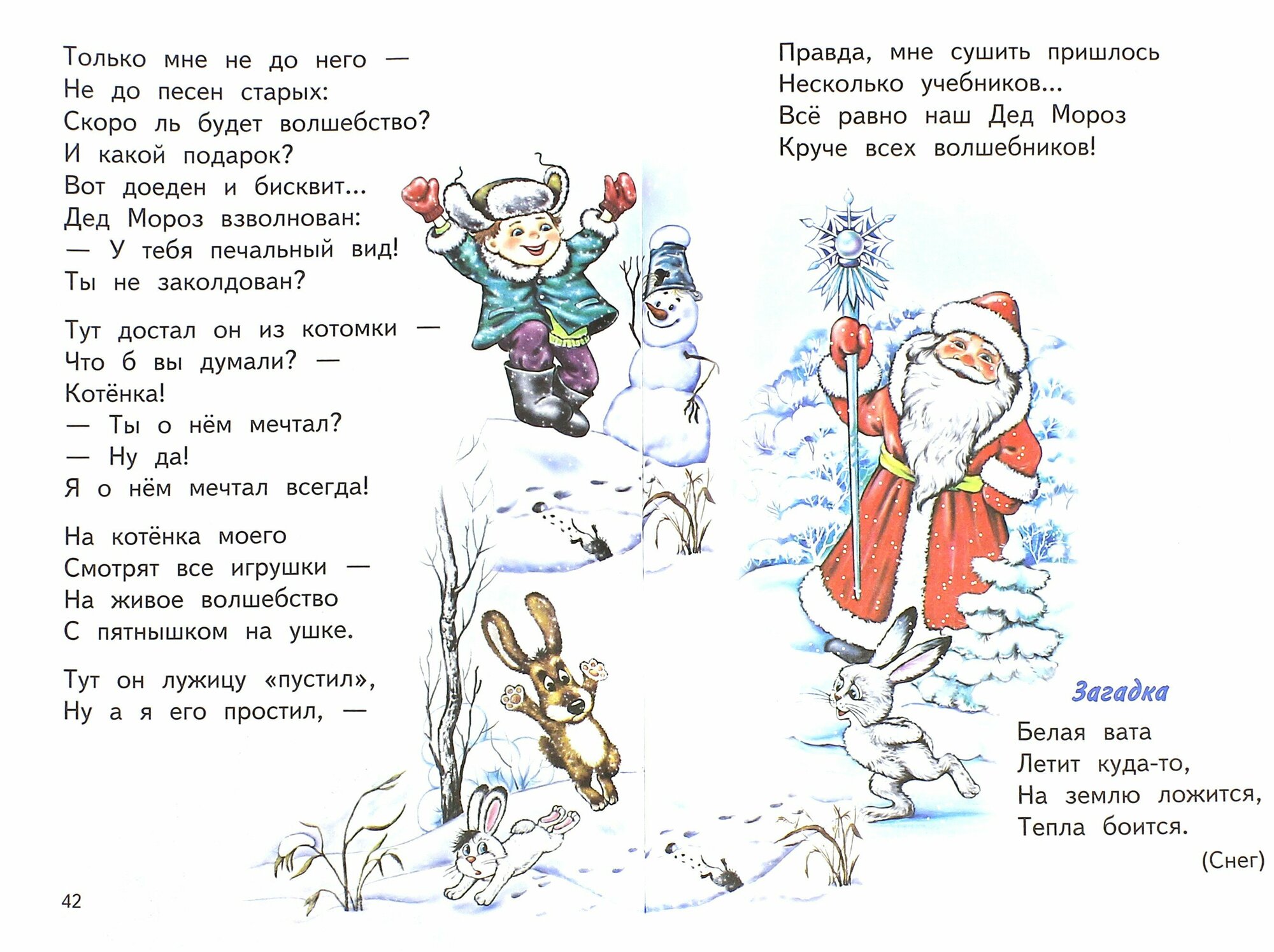 Зато почти после каждого стихотворения идёт загадка на зимнюю тему.