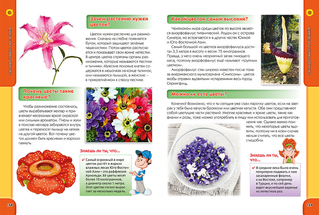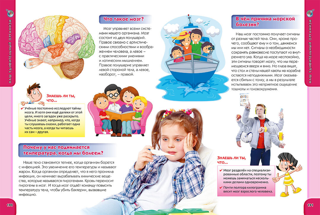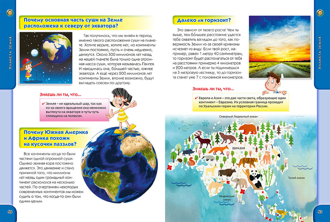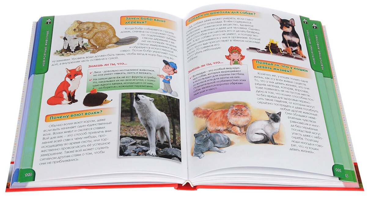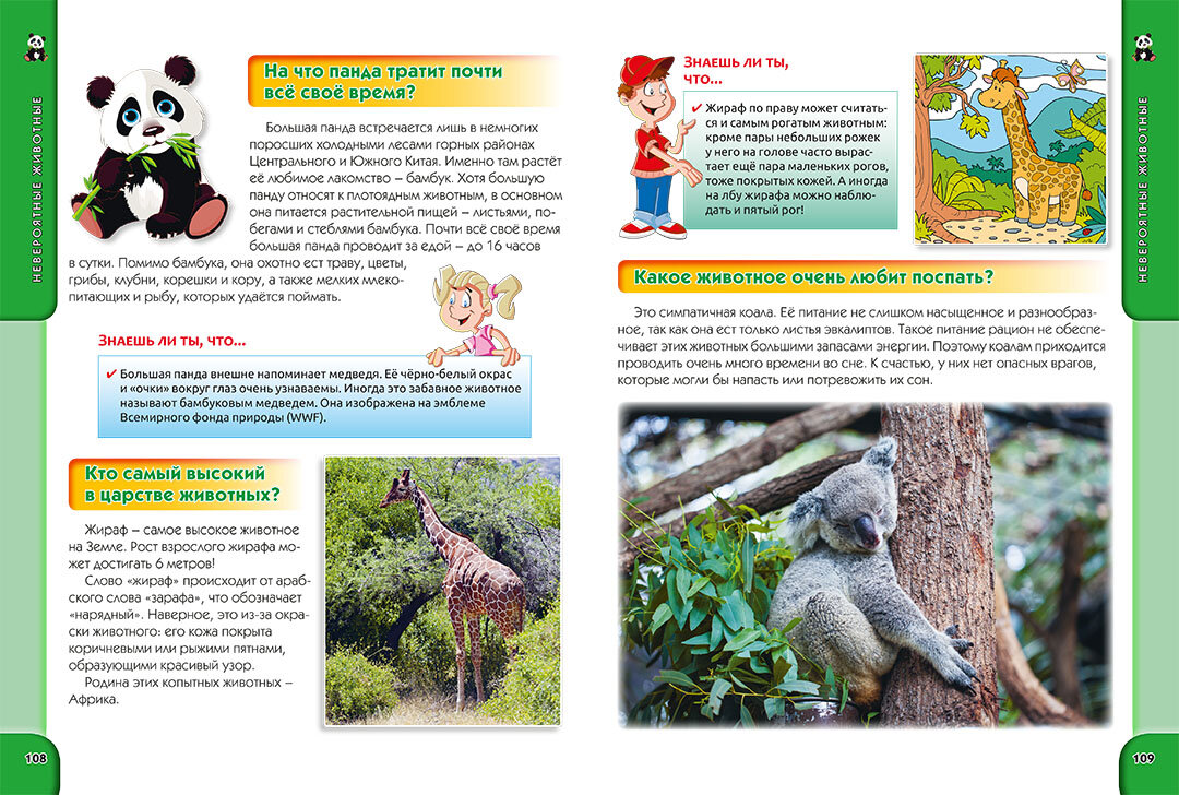 Детеныш у меня еще не совсем большой, потому хотел выбрать именно такую шуточно-развлекательную энциклопедию с разными темами обо всем на свете. Содержание этой книги мне вполне понравилось. Всего 6 больших тем, которые касаются всего: про космос, про Землю, про животных, про растения, человека и в общем про окружающий мир. Каждая большая глава в книге выделена своим отдельным цветом. А в тексте на страницах тоже выделены отдельным цветом блоки «знаете ли вы что». Там собраны самые необычные и интересные факты. И вот в каждой главе реально весь материал построен в формате ответов на вопросы: каждый абзац озаглавлен своим вопросом, а потом в тексте идет ответ. Правда ли в энциклопедии 1234 вопроса и ответа, не считал, но думаю реально так)) А еще в книжке такие классные иллюстрации. Они не просто детские, они именно милые и очень прикольные.