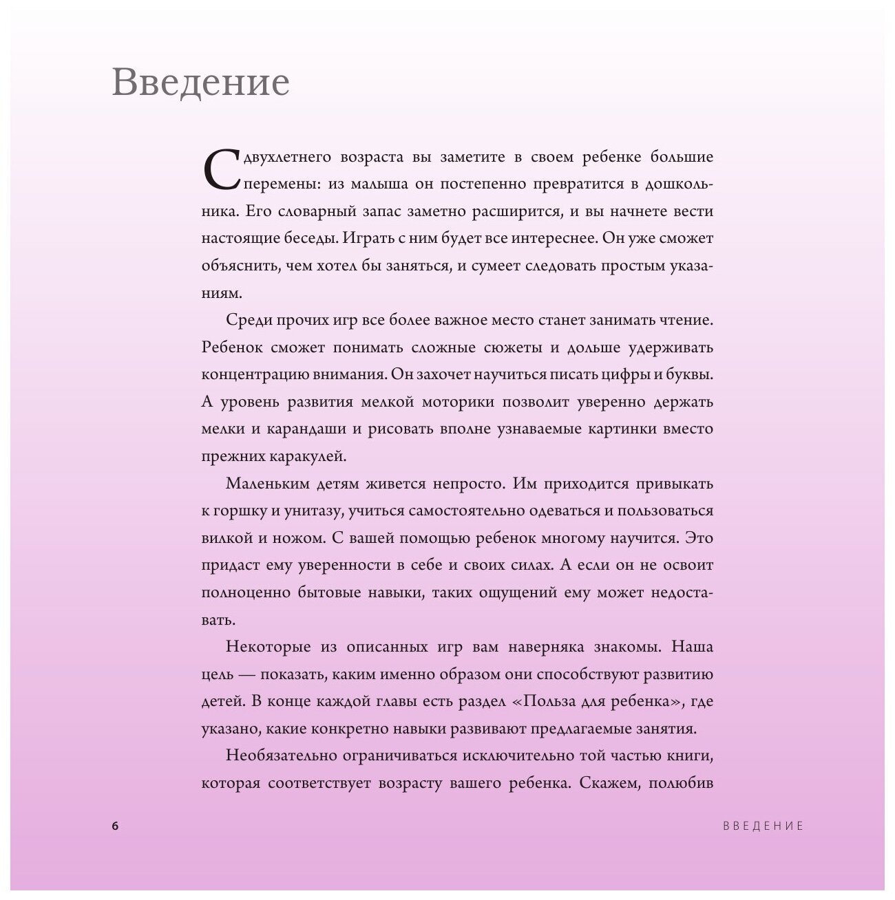 Возраст от 2 до 5 лет — очень значимый в развитии ребенка, в этот период он усвоит половину из того, что когда-либо узнает. Заниматься с ним становится интереснее, игры делаются более разнообразными. В этой прекрасно иллюстрированной книге вы найдете много идей по разностороннему развитию малыша. Например, игры, поощряющие к самостоятельности (пазлы, кубики) или стимулирующие подключиться к вашим занятиям (помочь в приготовлении обеда, вместе пойти в магазин). Отдельное внимание уделяется играм, развивающим навыки чтения, письма, мелкую моторику, дающим знания об окружающем мире. Примечательно, что все игры занимают не более 15-20 минут и не требуют больших финансовых вложений. Ребенок развивается самым естественным путем — в игре и общении с родителями.