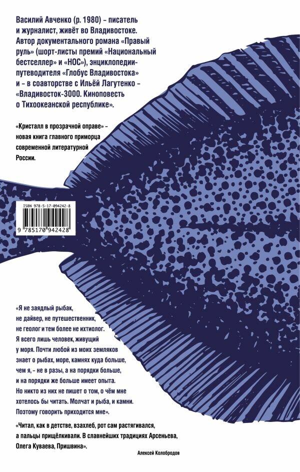 Василий Авченко - писатель и журналист, живет во Владивостоке. Автор документального романа "Правый руль" (шорт-листы премий "Национальный бестселлер" и "НОС"), энциклопедии-путеводителя "Глобус Владивостока" и - в соавторстве с Ильёй Лагутенко - "Владивосток-3000. Киноповесть о Тихоокеанской республике". Новая книга "Кристалл в прозрачной оправе" - уникальное, почти художественное и в то же время полное удивительных фактов описание жизни на Дальнем Востоке. "Я всего лишь человек, живущий у моря, - говорит автор. - Почти любой из моих земляков знает о рыбах, море, камнях куда больше, чем я. Но никто из них не пишет о том, о чём мне хотелось бы читать. Молчат и рыба, и камни. Поэтому говорить приходится мне". Книга вошла в шорт-лист премии "Национальный бестселлер".
