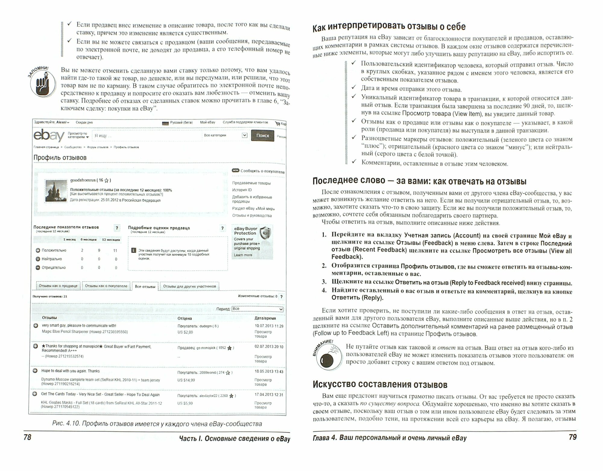 eBay — международный рынок XXI столетия. Так не пора ли и вам приступить к освоению этого рынка? Марша Кольер, которая знакома с eBay как никто другой, расскажет, как искать нужные товары, совершать разумные покупки, выигрывать аукционы, заключать выгодные сделки, экономить и зарабатывать деньги!• Начните с этого. Зарегистрируйтесь, научитесь ориентироваться на сайте eBay, ознакомьтесь с инструментами покупки и продажи.• Найдите выгоднее сделки. Научитесь пользоваться поисковой, системой eBay; узнайте, на что нужно обращать особое внимание в объявлениях о товарами как получить информацию о продавце.• Побеждайте в аукционах. Изучайте ситуацию; следите за конкурентами, разрабатывайте свои победные тактики.• Оформите свою покупку. Общайтесь с продавцом, оплачивайте товары, оставляйте отзывы после успешного завершения сделок.• Общайтесь. Заводите знакомства с друзьями по интересам, изучайте возможности eBay и чуткой опыт благодаря социальным группам Facebook® и ВКонтакте, сервису микроблогов Twitter®.• "Частное" значит "неприкосновенное". Научитесь защищать свою конфиденциальную информацию и делать eBay безопасным для всех пользователей.• Решайте проблемы. Научитесь решать проблемы, возникающие в ходе транзакции, и уясните, когда ставить eBay в известность о той или иной проблеме.