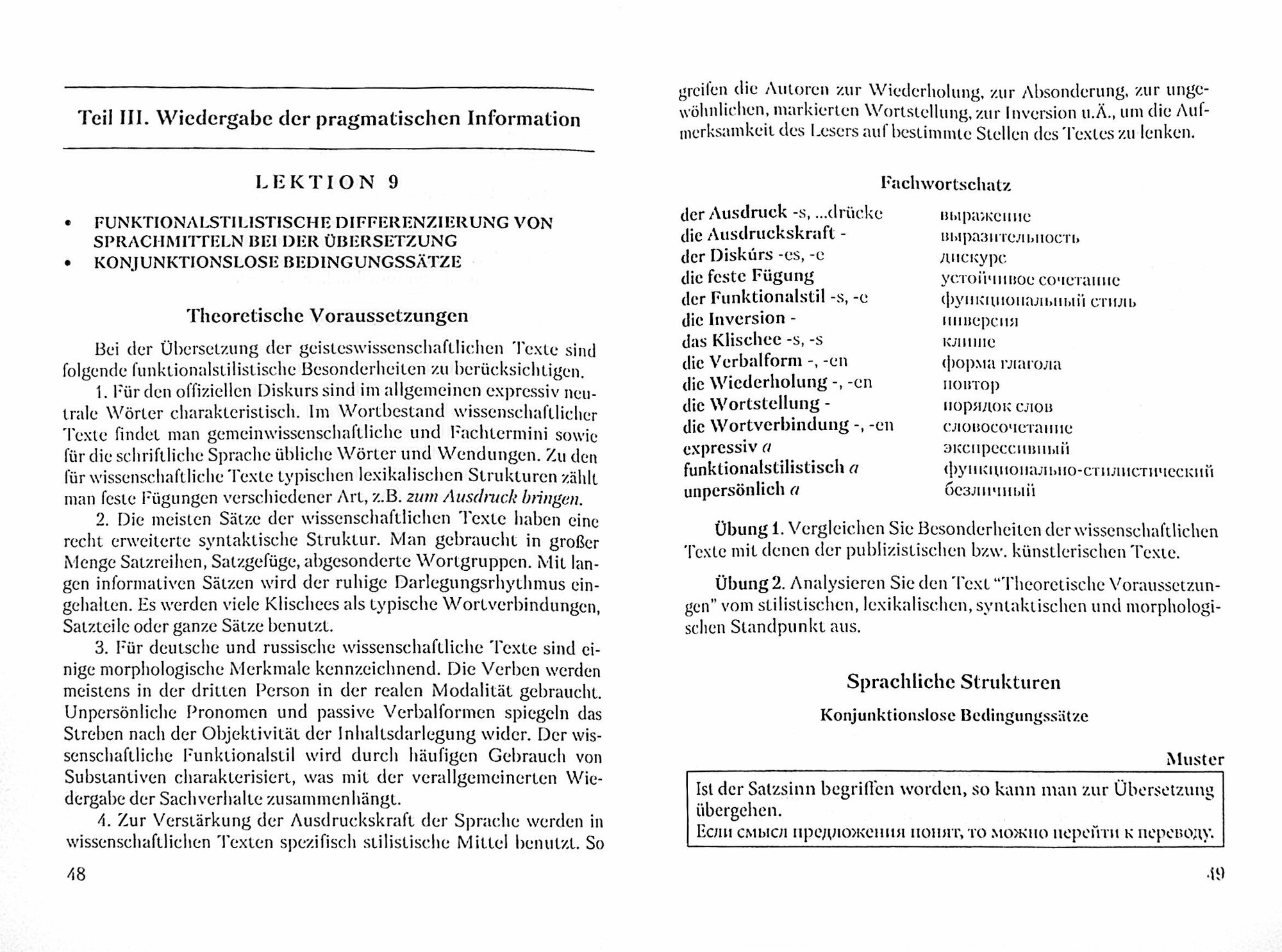 Учебник написан на немецком языке. Он включает 13 уроков, рассчитанных на 40 часов аудиторных практических занятий. Урок состоит из теоретического материала по определенной теме аспекта перевода с иностранного языка на русский и аспекта языковых особенностей научного стиля, списка специальных терминов по указанной специальности, предтекстовых упражнений, текста для перевода, послетекстовых упражнений. Учебным материалом для перевода послужили оригинальные научные тексты на немецком языке. В конце учебника приведены дополнительные тексты для перевода и терминологический словарь.