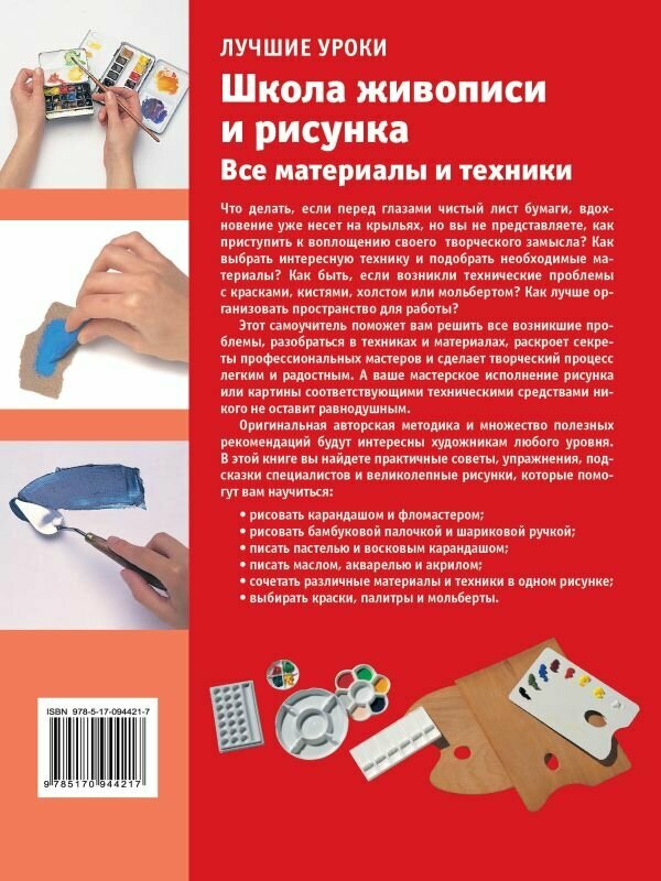 Книга обо всем по чуть-чуть. Про различные техники и материалы. Подойдет как основа для начинающих художников, для тех кто только начинает учиться рисовать. Профессионалам вряд ли будет интересна. Хотя она заявлена именно как учебное пособие. Много подробных цветных иллюстраций. Прочитав книгу, "Школа живописи и рисунка. Все техники", а так же выполняя не сложные уроки и задания, можно определиться с выбором материалов, с которыми вам больше понравится работать. Есть подробное описание того, что понадобится для того или иного рисунка, и пошаговое руководство к действию. В общем для новичков самое то. Поставила бы книге твердую четверку.