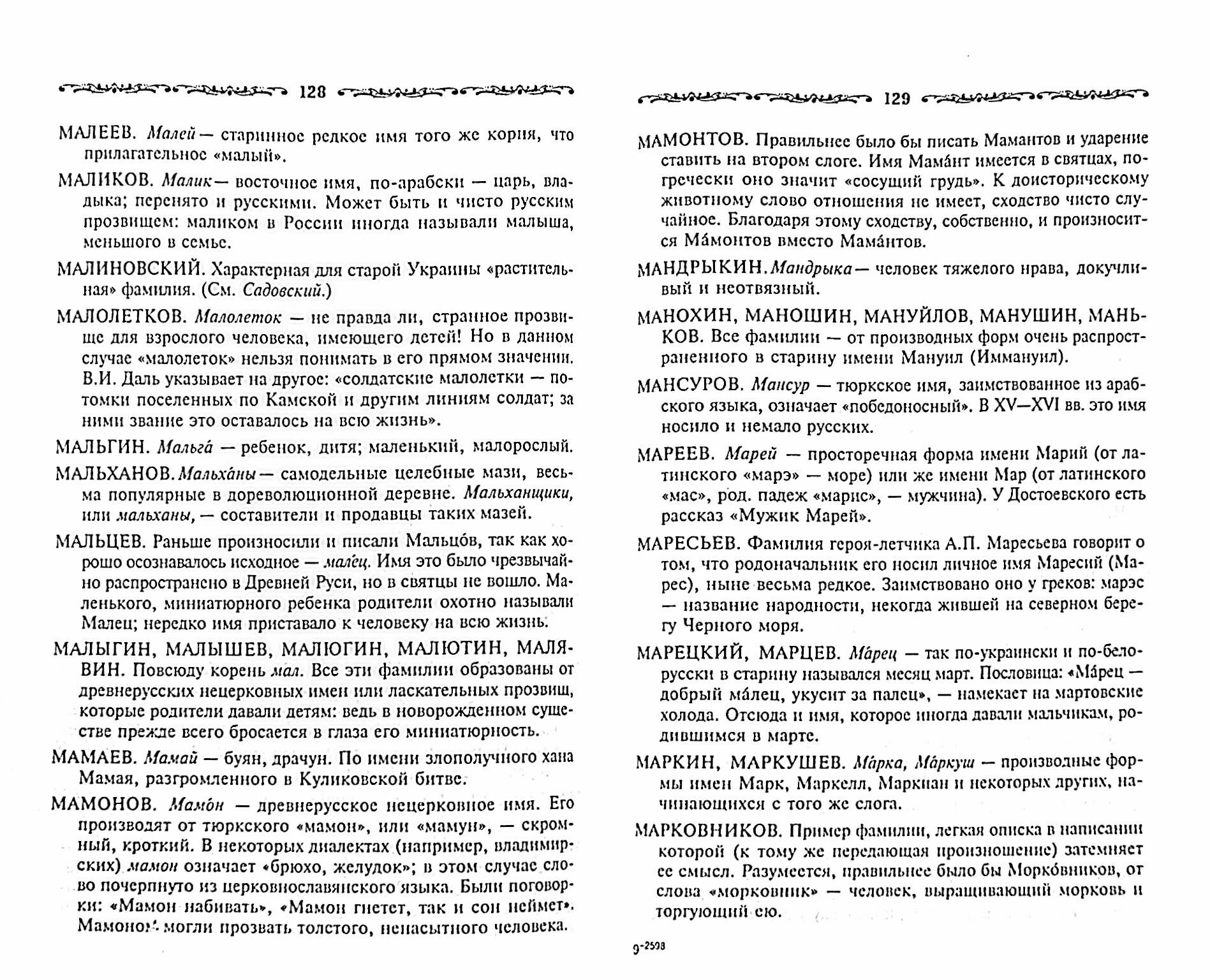Весьма интересная книга. В ней раскрыто происхождение тысяч фамилий, многие из которых и сейчас на слуху. Тут и церковные, и профессиональные, географические и искусственно образованные. Фамилии расположены в алфавитном порядке. Дано исходное слово и его расшифровка. Приведу несколько иллюстраций.