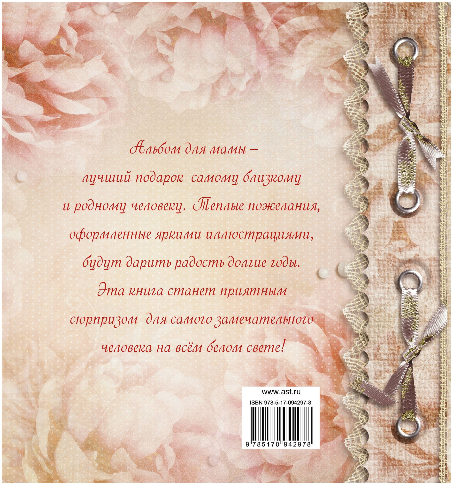 Альбом для мамы - лучший подарок самому близкому и родному человеку. Теплые пожелания, оформленные яркими иллюстрациями, будут дарить радость долгие годы. Эта книга станет приятным сюрпризом для самого замечательного человека на всём белом свете!