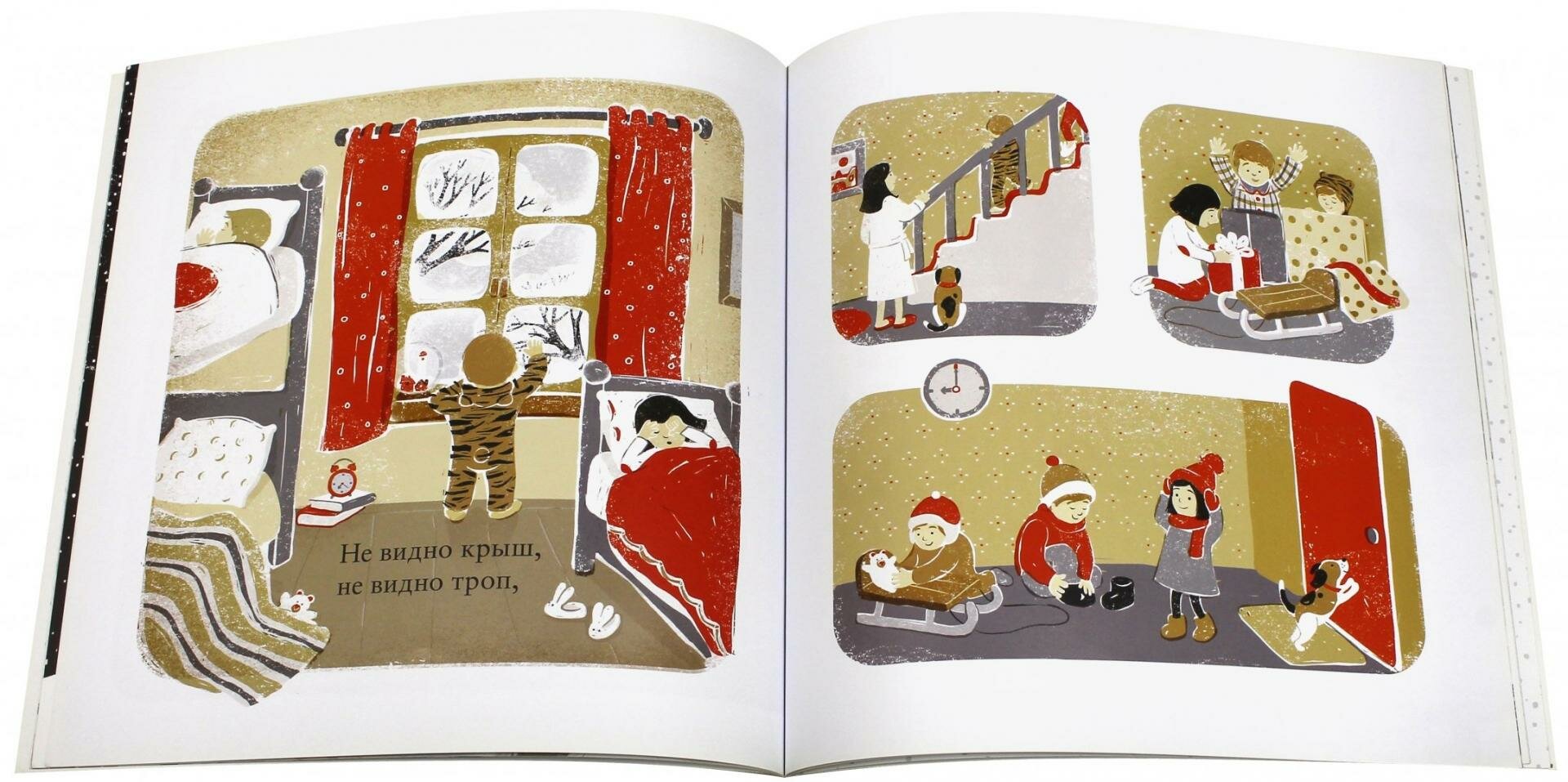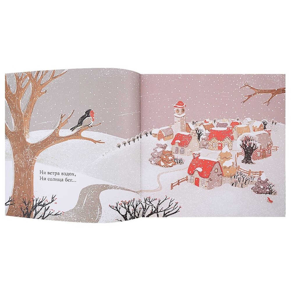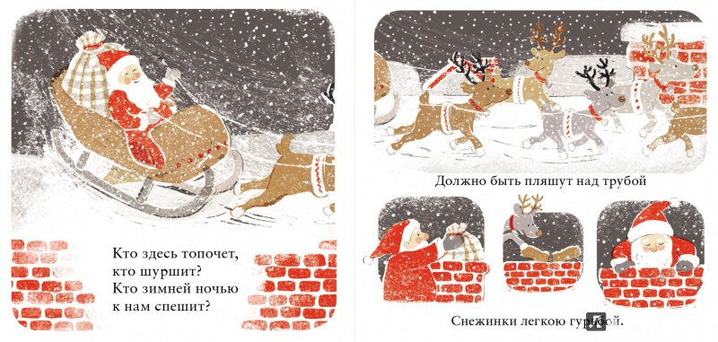 Эту книгу я тоже подарила сынуле на Новый Год. Просит читать ее на ночь. Очень спокойные иллюстрации, текста мало. Иллюстрации можно рассматривать долго. Я бы сказала, что книга умиротворяющая:) Очень она нам понравилась. Были сомнения, по поводу приобретения, потому как новинка и отзывов на нее не было, и иллюстраций было выложено для ознакомления мало, но не пожалела:) Замечательная книга! Стих тоже очень понравился, спокойный... красивый) Книга дарит ощущение приближающегося Праздника!