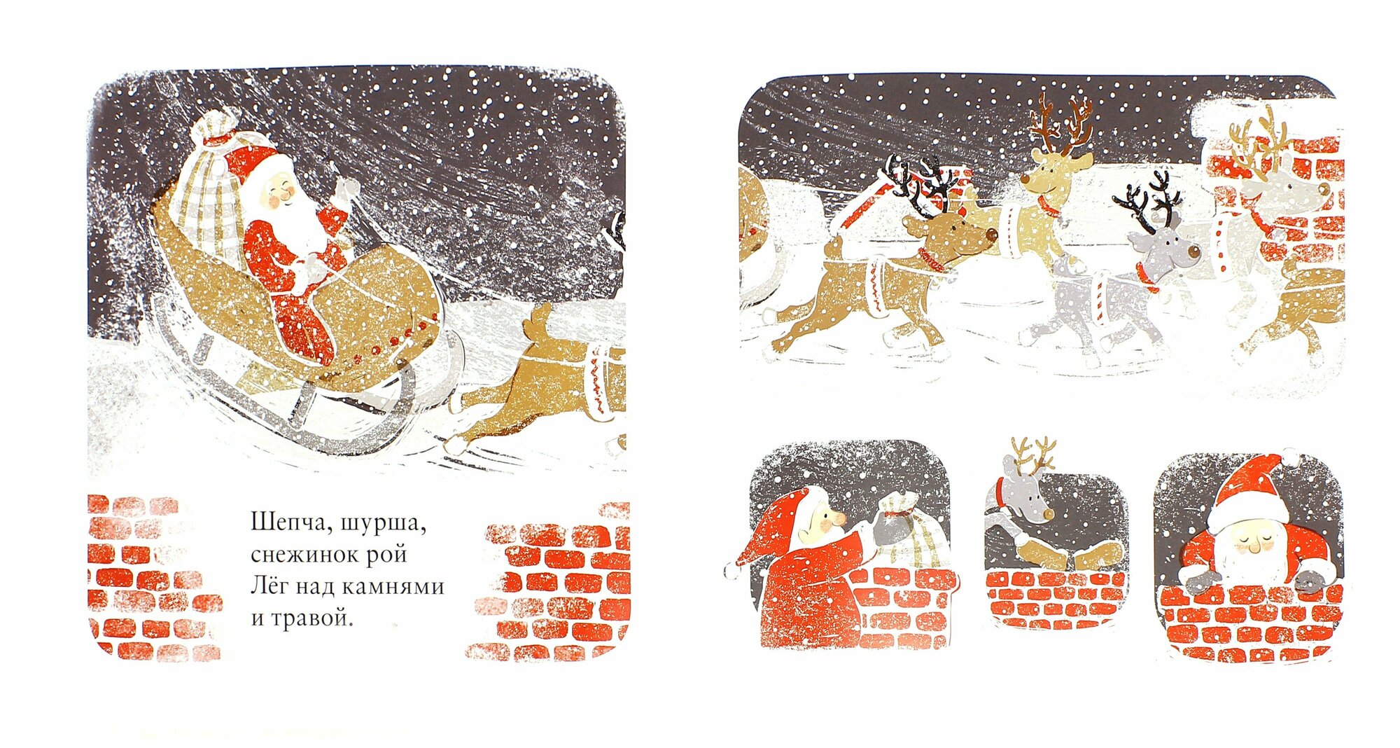 Перелистываются страницы - рисунки Каролины Рабей с застывшими моментами маленьких радостей счастливой семьи накануне и в день волшебного сказочного Рождества с записанными строками, словно вскользь, быстро, чтобы уловить не всегда выразимое словами ощущение чуда …И вдруг, когда волшебство Рождественского дня завершилось, невыразимо трогательно, нежно, словно падающий с небес снег, на последней странице, словно завершая счастливо прожитый день, зазвучали строки чарующего стихотворения Уолтера де ла Мера «Снег»