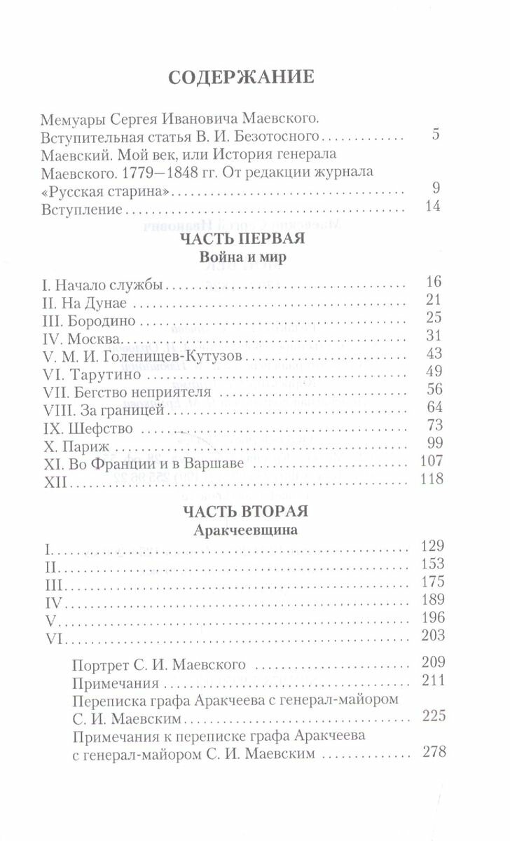 Рассматриваемая книга состоит из нескольких частей, производно озаглавленных редакцией «Русского слова» — «Война и мир» (объемом в 110 стр.), преимущественно о событиях 1812-14 гг., и «Аракчеевщина» (объемом в 80 стр.). Кроме этого, в качестве приложения дана переписка графа Аракчеева с генералом Маевским (объемом в 50 стр.). Последняя, в отличие от воспоминаний Маевского, представляет собой оригинальные исторические документы, и очень интересна для характеристики Аракчеева.