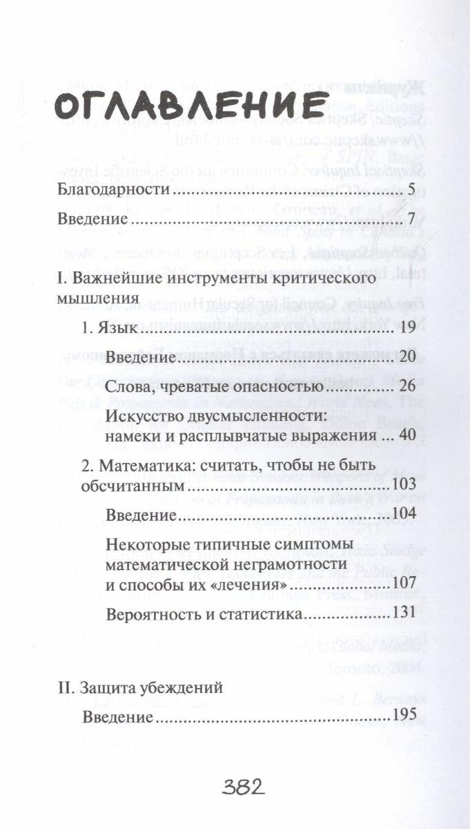 Анализ языка, особенности лексики, многозначность слов, манипулятивные приемы убеждения, логические ошибки, утаивание существенных данных, разновидности математической неграмотности, в каких случаях и в какой степени доверять собственному опыту, научному эксперименту, средствам массовой информации – вот далеко неполный перечень затрагиваемых в книге вопросов. Автору удается сохранить хрупкий баланс между неизменным скептицизмом и открытостью новым идеям. В книге приводятся практические рекомендации, прошедшие апробацию временем и опытом.