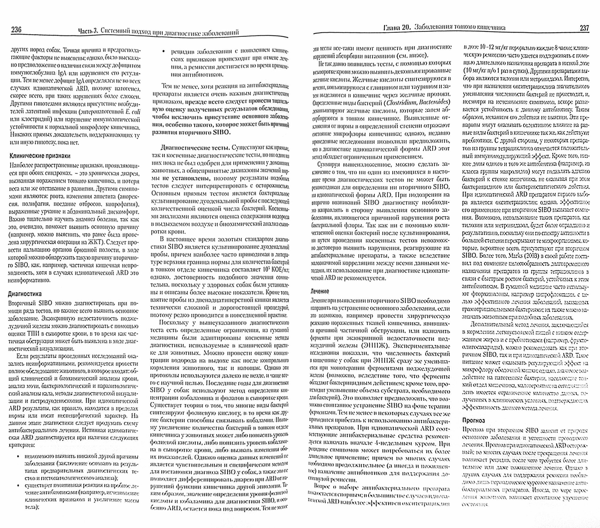В коротких главах второй части книги содержатся описания практических подходов к обследованию животных с различными клиническими проявлениями заболеваний: дисфагией, рвотой, острой и хронической диареей, малабсорбцией, желудочно-кишечными кровотечениями, болезненной и затрудненной дефекацией, тенезмами, желтухой, печеночной энцефалопатией и инфекционными болезнями. Все главы построены по единому плану: в них приведено описание клинических признаков заболеваний, дифференциальная диагностика с учетом клинической значимости отдельных нарушений, а также пошаговый алгоритм проведения диагностики.