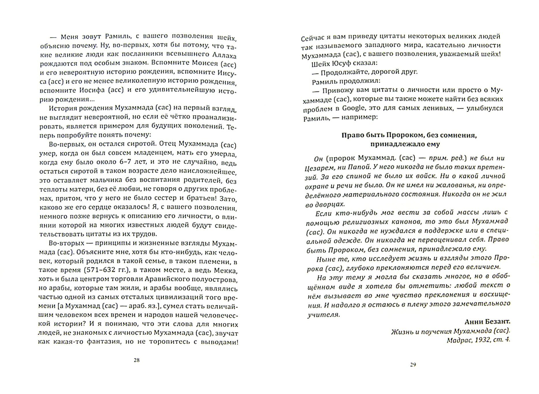 В книге, написанной в популярной форме, раскрываются основные принципы исламского вероисповедания. Используя форму диспута между главными героями, автор старается развенчать многие предубеждения современного общества против этой религии.