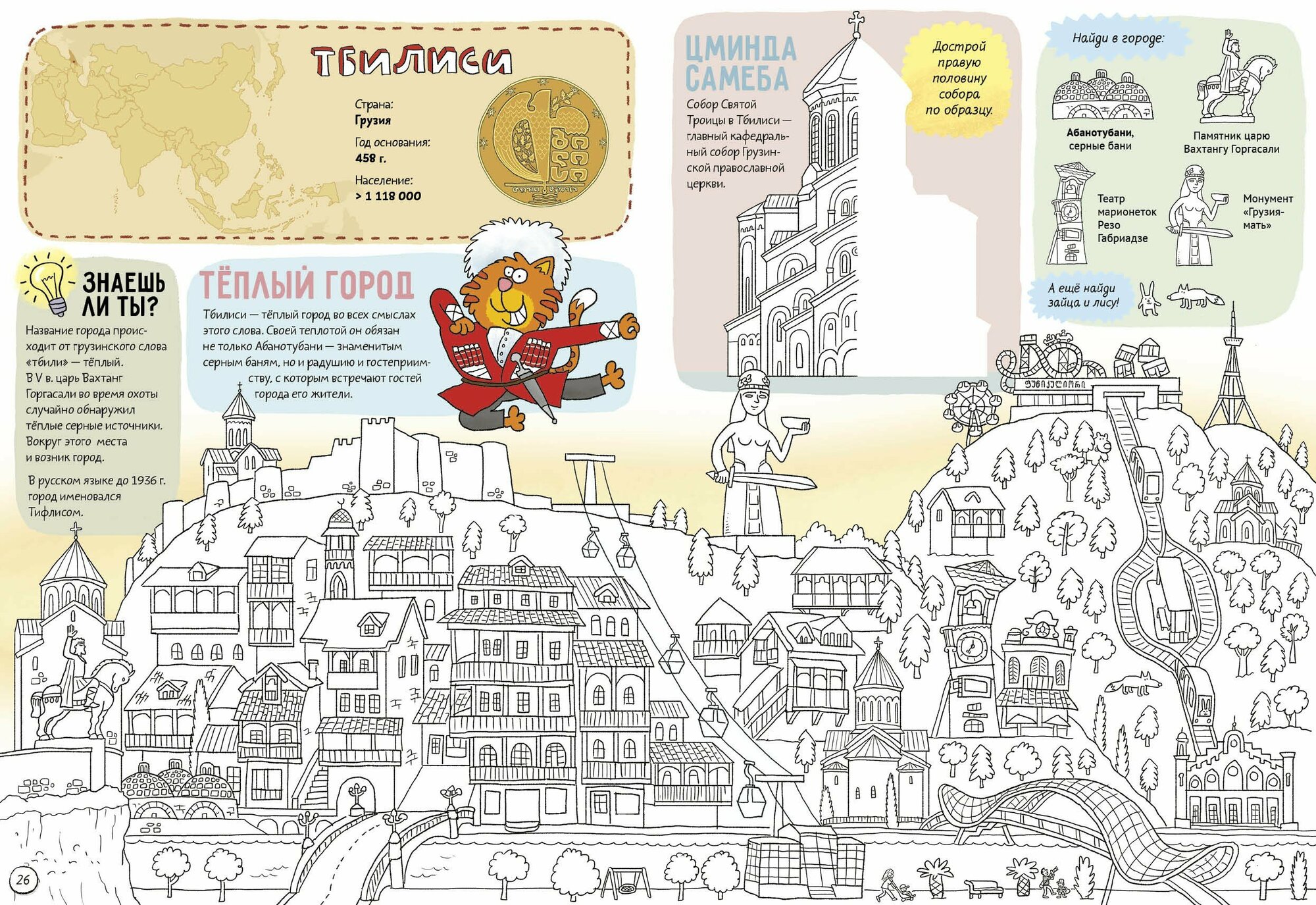 Купила эту раскраску-рисовалку для расширения кругозора детей 8 и 12 лет. Очень понравились краткие, но ёмкие сведения о городах и объектах. Считаю, полезно таким ненавязчивым способом знакомить детей с географией/историей. Но нашла и минус, который вслух подтвердила старшая дочь: непонятно, каким цветом раскрашивать тот или иной рисунок (нет подсказки автора ввиде цветного мазка). В качестве примера могу привести книжку-раскраску "Глобус в чемодане", где на раскрашиваемых объектах есть подсказки-мазки нужного цвета (для примера- страничка Индия)