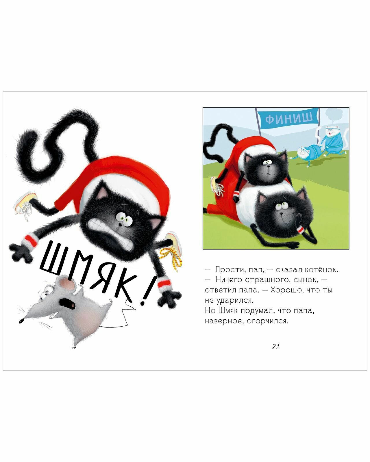 Сыну книга понравилась. Сюжет простой и веселый. Котенок Шмяк просто молодец, что хочет вывести папу из унылого состояния! Веселый спортивный конкурс - хорошее решение проблемы!