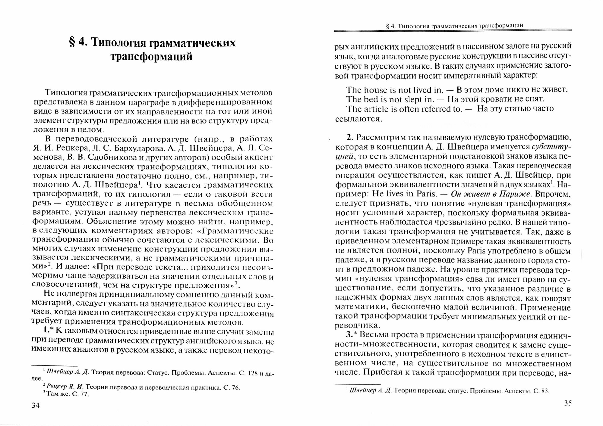 В монографии рассматриваются три значения термина "перевод" в их взаимосвязи; центральное место в работе отводится переводу как процессу. Описание перевода как процесса осуществляется в терминах моделей перевода, или переводческих стратегий, которые реализуются за счет трансформационных методов. Подробно представлена типология грамматических, лексических и грамматико-лексических трансформаций, применяемых в практике перевода. Выводы иллюстрируются текстовыми примерами из американских и английских источников.