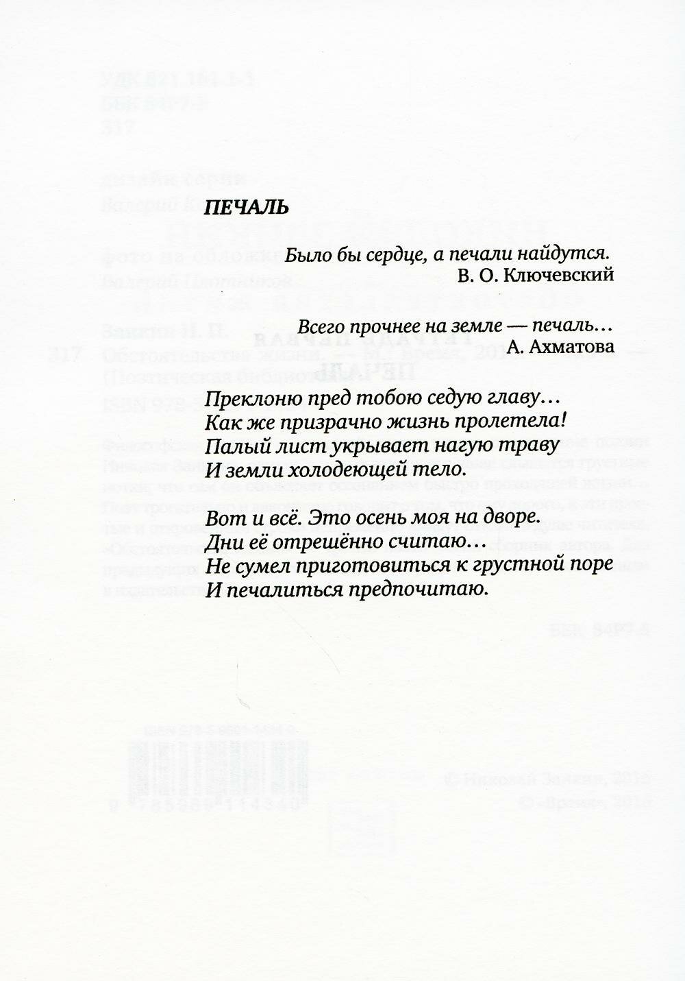 Философская лирика - пожалуй, самое точное определение поэзии Николая Заикина, однако в новых стихах все чаще слышатся грустные нотки, что сам он объясняет осознанием быстро проходящей жизни... Поэт трогательно и лаконично говорит о том, что ему дорого, и эти простые и откровенные строки непременно найдут отклик в душе читателя. "Обстоятельства жизни" - третий поэтический сборник автора. Два предыдущих "Промежутки бытия" и "Пределы смысла" также вышли в издательстве "Время".