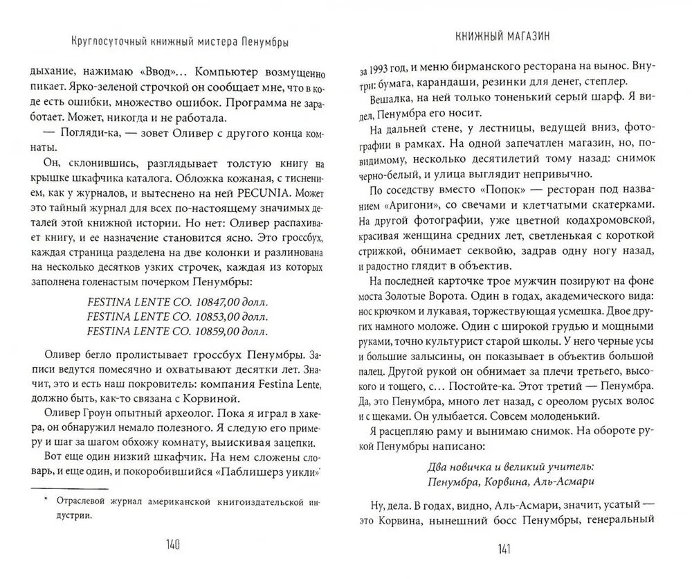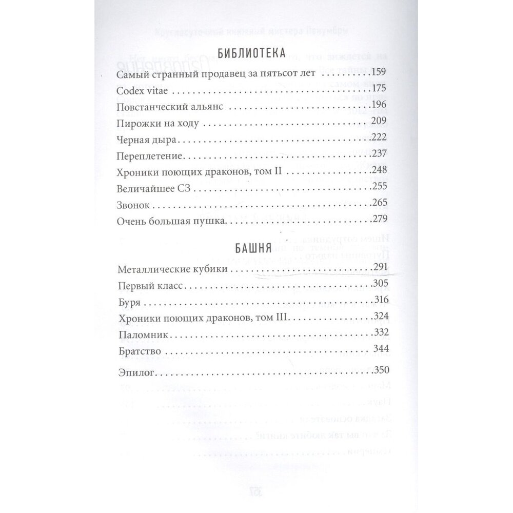 Книжный магазин — идеальное место, чтобы спрятать концы в воду. На пыльных дальних полках мистер Пенумбра хранит книги, которые, если верить Гуглу, не существуют. Вереница странных символов, тисненные золотом переплеты, редкие читатели и ночной продавец, которому эксцентричный владелец ясно дает понять: не задавай вопросов, а главное — не читай. Но паутина загадок уже оплетает героя. Пара неосторожных фраз — и вот уже целый батальон друзей: книжники и программисты из Гугла, знатоки античности и фанаты «Звездных войн» — пытается разгадать шифр полувековой давности.