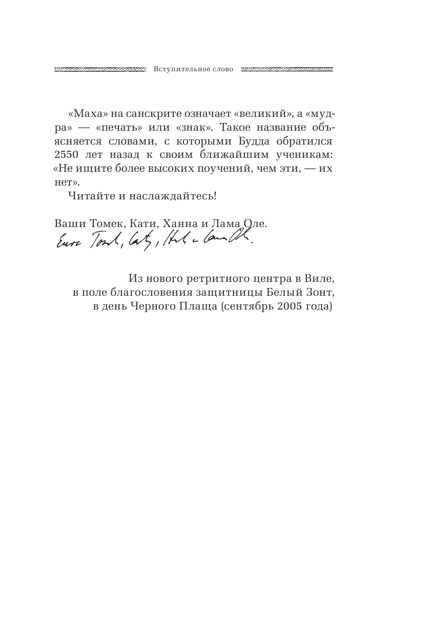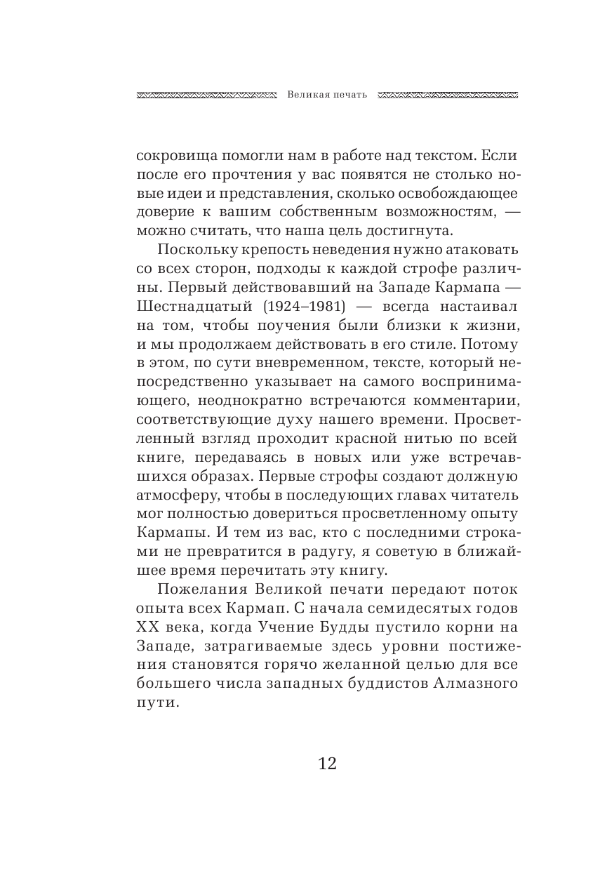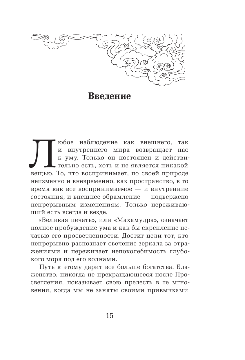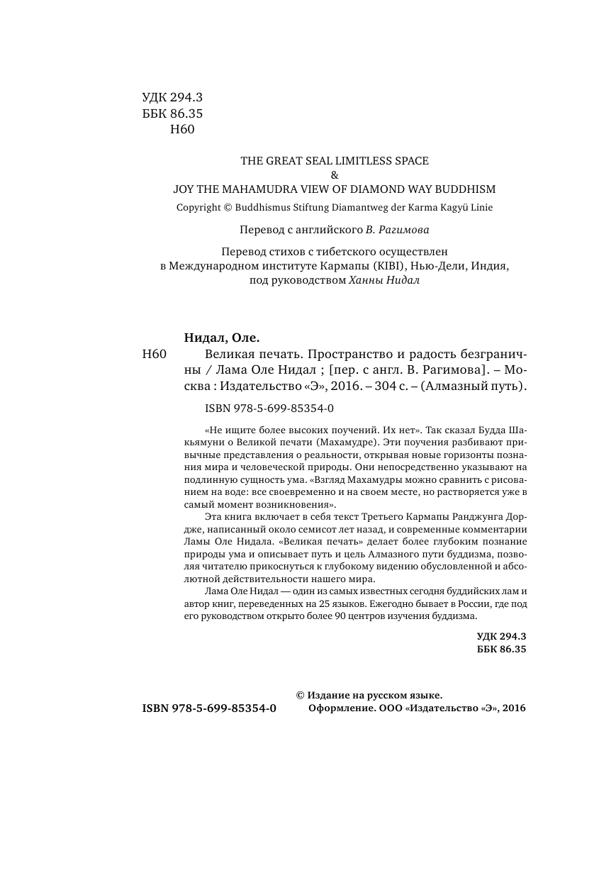 «Не ищите более высоких поучений. Их нет». Так сказал Будда Шакьямуни о Великой печати (Махамудре). Эти поучения разбивают привычные представления о реальности, открывая новые горизонты познания мира и человеческой природы. Они непосредственно указывают на подлинную сущность ума. «Взгляд Махамудры можно сравнить с рисованием на воде: все своевременно и на своем месте, но растворяется уже в самый момент возникновения». Эта книга включает в себя текст Третьего Кармапы Ранджунга Дордже, написанный около семисот лет назад, и современные комментарии Ламы Оле Нидала. "Великая печать" делает более глубоким познание природы ума и описывает путь и цель Алмазного пути буддизма, позволяя читателю прикоснуться к глубокому видению обусловленной и абсолютной действительности нашего мира. Лама Оле Нидал — один из самых известных сегодня буддийских лам и автор книг, переведенных на 25 языков. Ежегодно бывает в России, где под его руководством открыто более 90 центров изучения буддизма.
